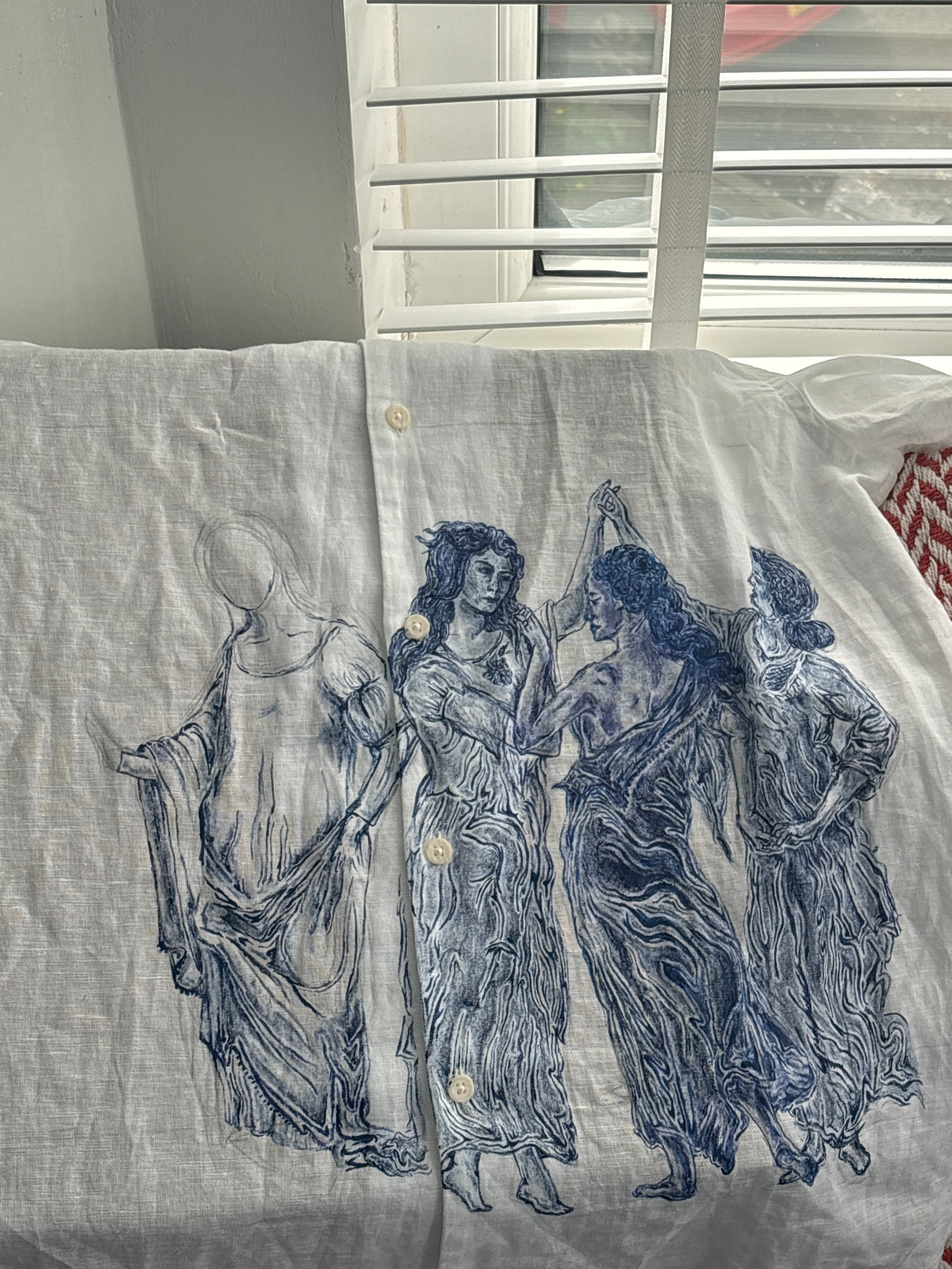 A white linen shirt with a blue print of figures in flowing robes is draped near a window. The window is white with a gray, Venetian blind. The background is blurred and indistinct but appears to be i…read more