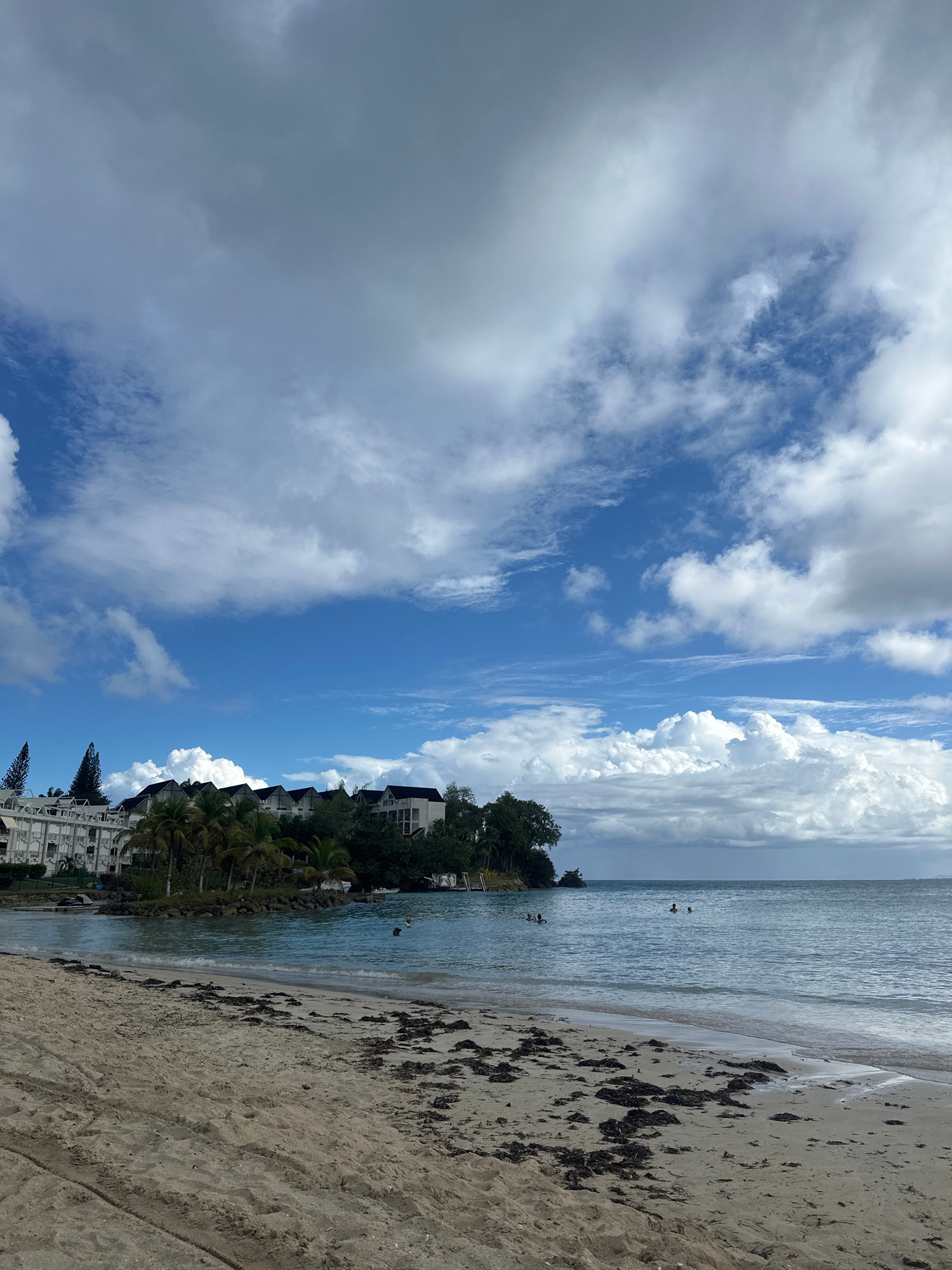 The image depicts a coastal scene in Le Gosier, France, featuring a beach with light-colored sand covered in scattered dark seaweed or debris. The water is calm and reflects the sky, with a few indivi…read more