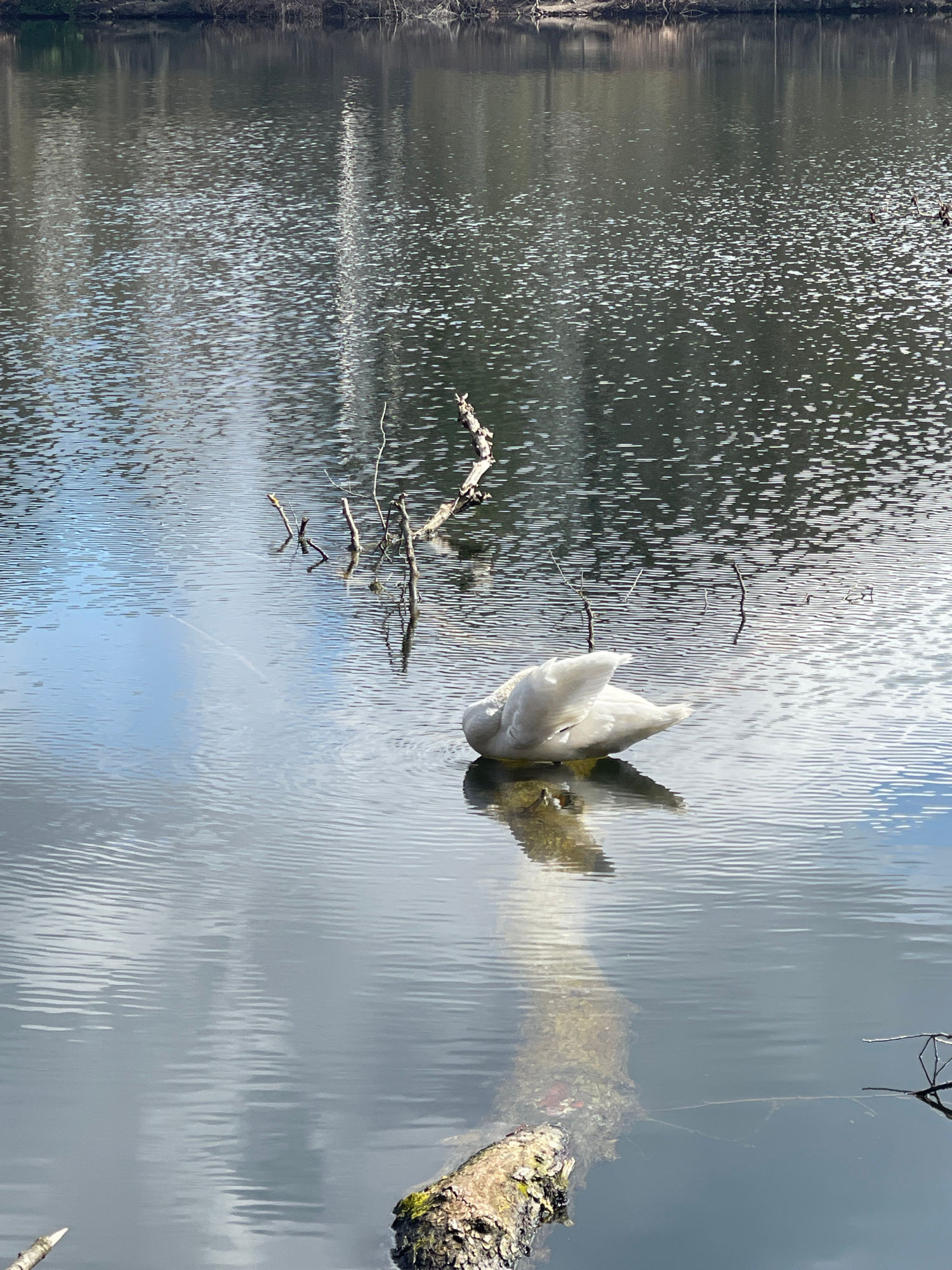 The image shows a body of water with reflections of the sky and surrounding trees. A white swan is partially submerged, likely swimming or feeding. Branches and a mossy log are visible in the water, cā¦read more