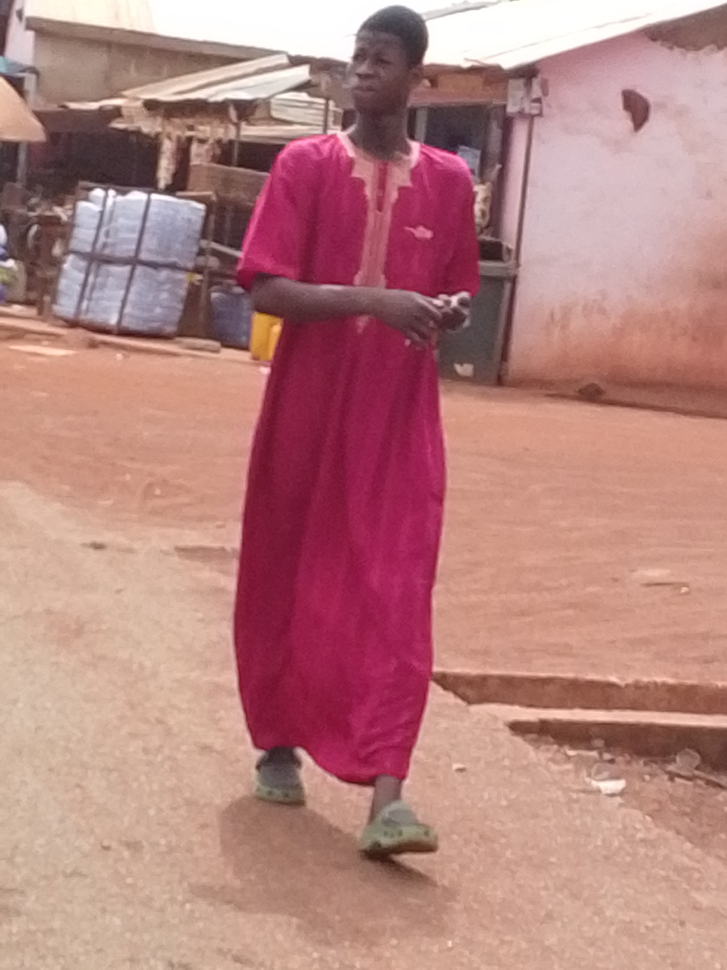 A young male is depicted walking on a reddish-brown unpaved surface in Tamale, Ghana. He wears a magenta, short-sleeved kaftan-style garment featuring a light-colored patterned placket, and olive-gree…read more