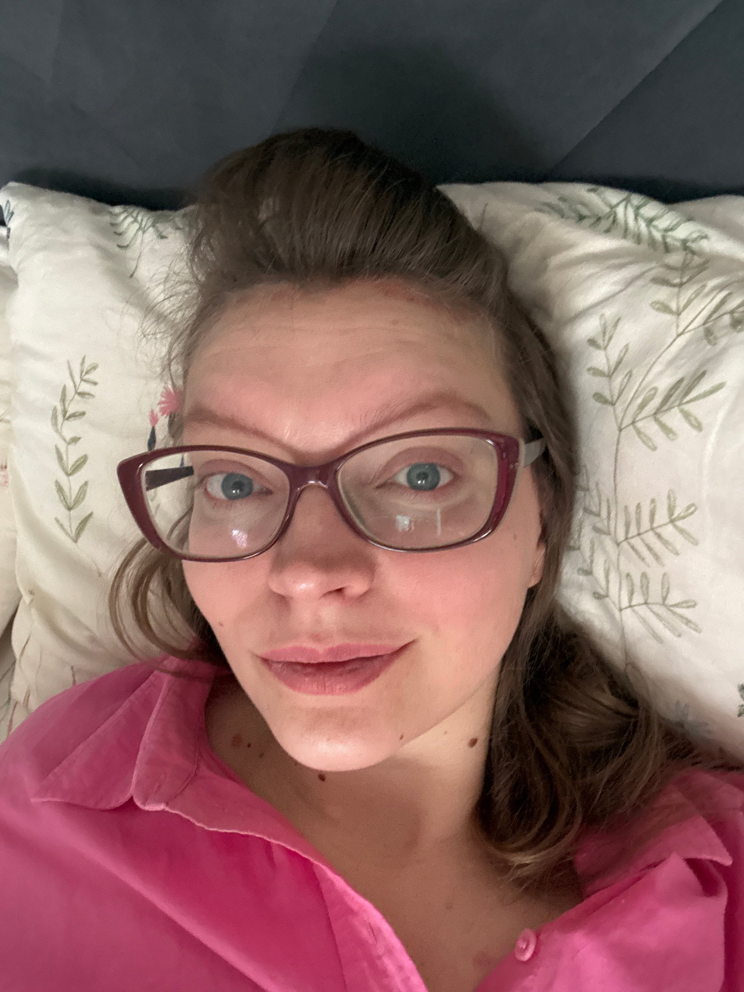 A woman is lying on a pillow, wearing glasses and a pink shirt. The pillow has a leaf pattern. She appears to be indoors. There is no information provided to indicate that this image was taken in Izheβ¦read more