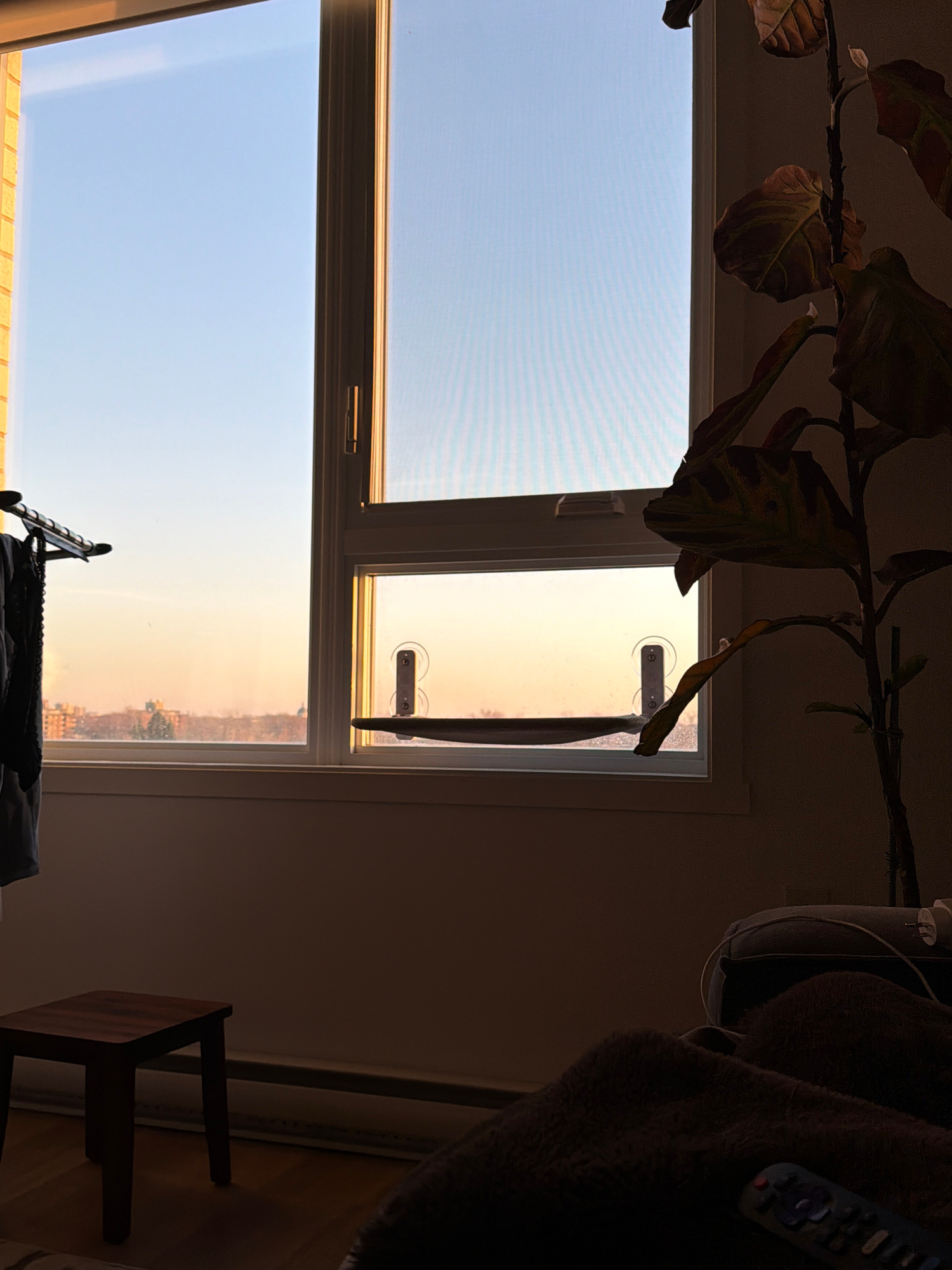 The image shows an interior view of a room in Laval, Canada, facing a window divided into two sections. The upper section has a smaller operable window to its right, held open by suction cup handles.…read more