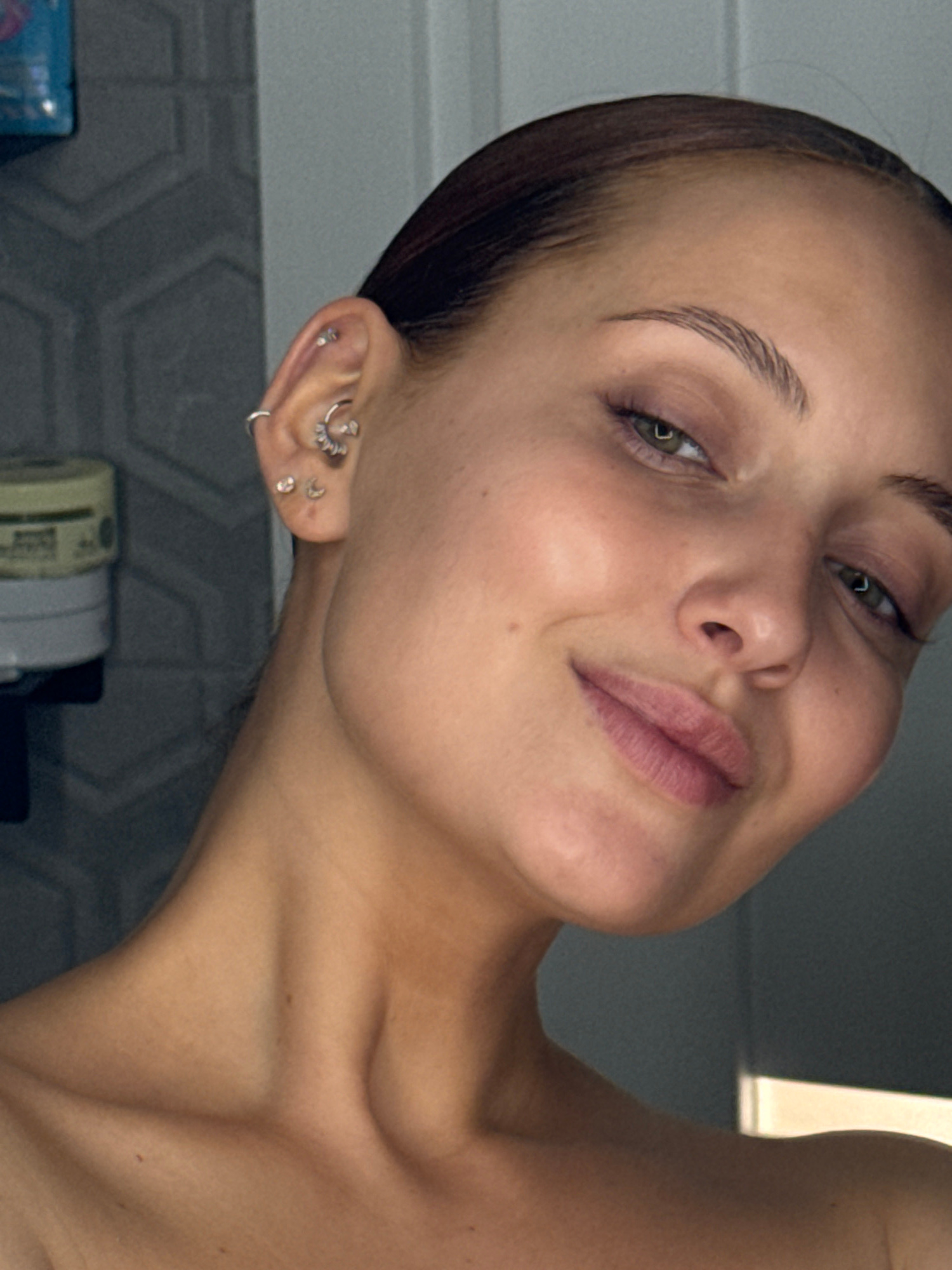 A close-up, angled portrait captures a fair-skinned woman with dark brown hair pulled back, showcasing her face and upper chest. She has green eyes, light eyebrows, and a slight smile. Her ear is ador…read more