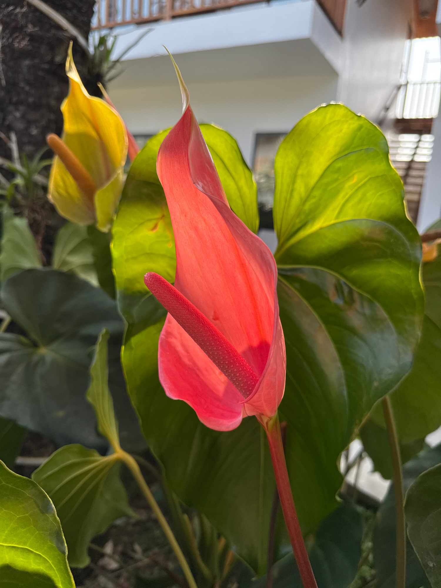 The image shows a close-up of an Anthurium plant, with a prominent pink flower and spadix, as well as large green leaves. There is also a yellow Anthurium flower in the lower-left corner. The scene ap…read more