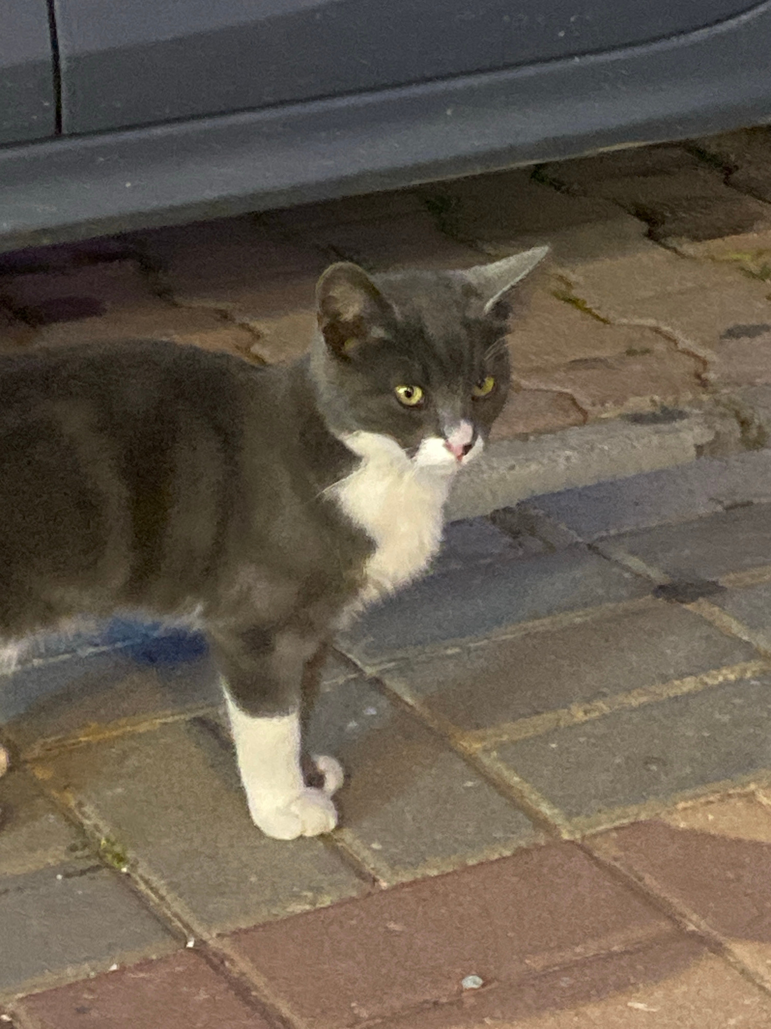 A gray and white cat lies on a brick sidewalk, next to a dark-colored vehicle or object. The cat is lying on its side with one paw extended. The background suggests an urban environment, possibly a st…read more