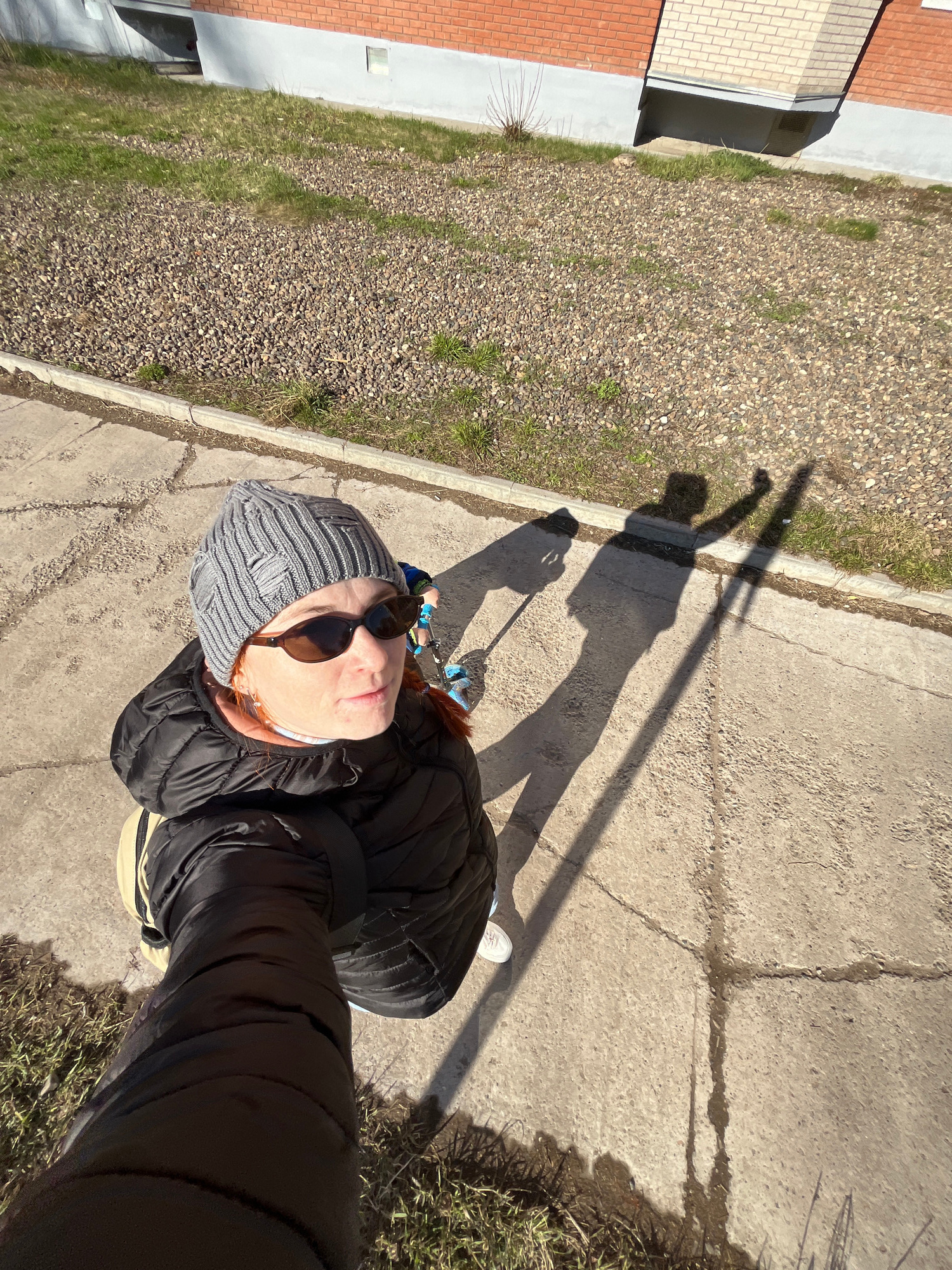 A first-person, top-down perspective photo shows a person standing on a concrete sidewalk in Chaikovsky, Russia. The person is wearing a gray knit cap, sunglasses, and a black puffer jacket. The shado…read more