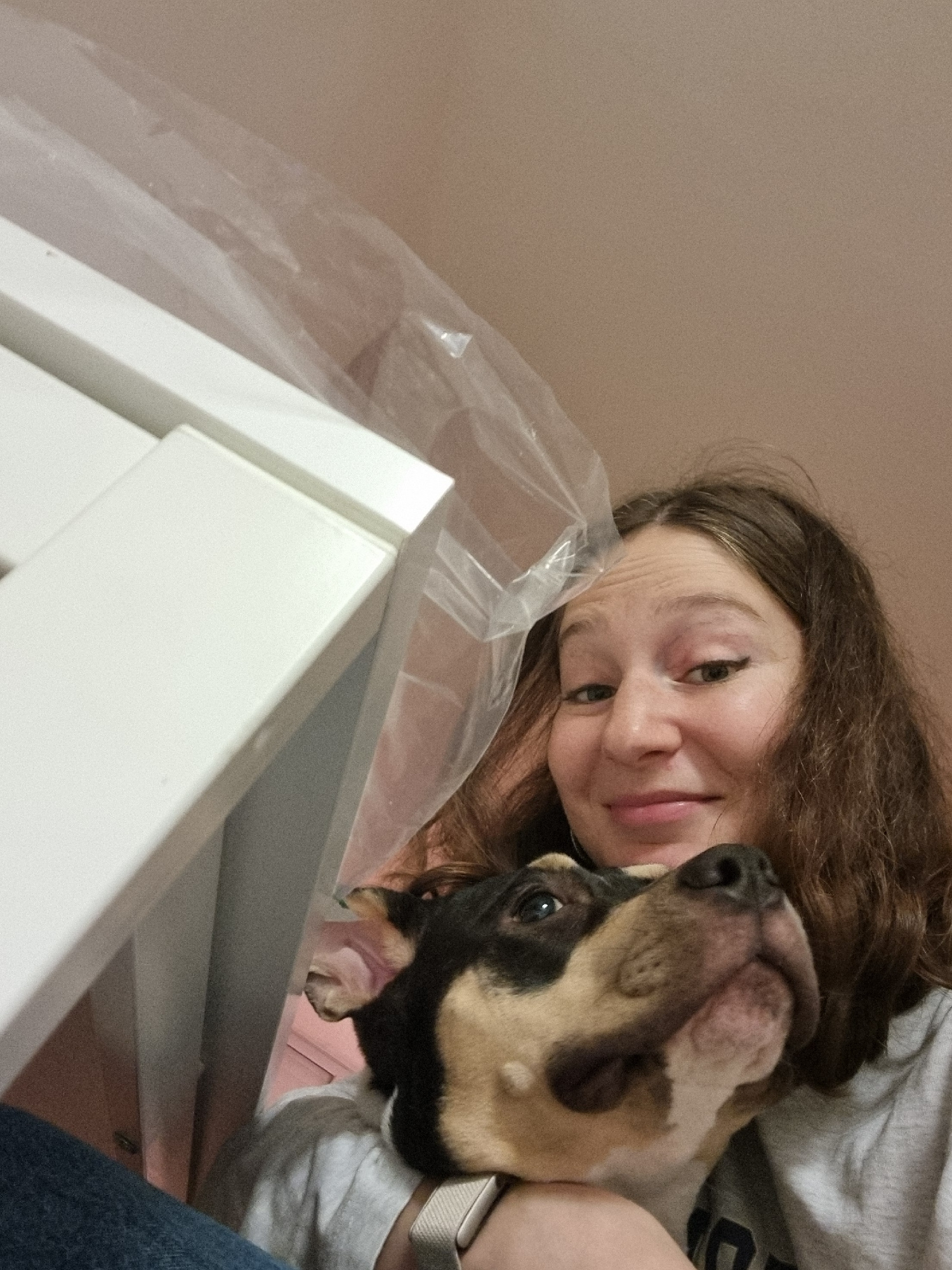 The image depicts an indoor scene in the city of Tel-Aviv, Israel, featuring one female individual and a dog. The female, with brown, wavy hair, is positioned in the center-right of the frame, smiling…read more
