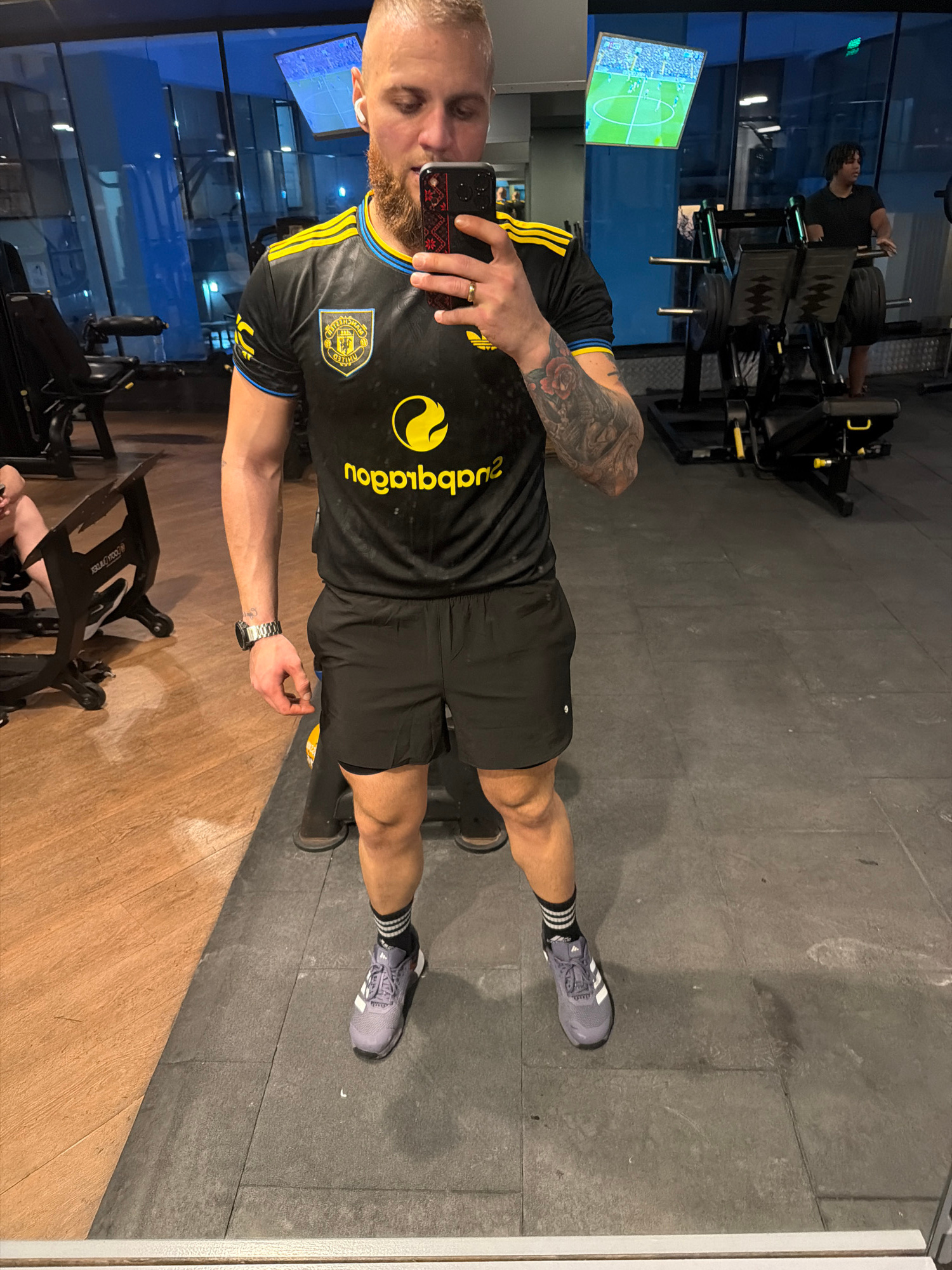 The image is a selfie taken by a man in a gym. The man is wearing a black and yellow soccer jersey, black shorts, and grey Adidas running shoes with black and white striped socks. He has a short, blon…read more