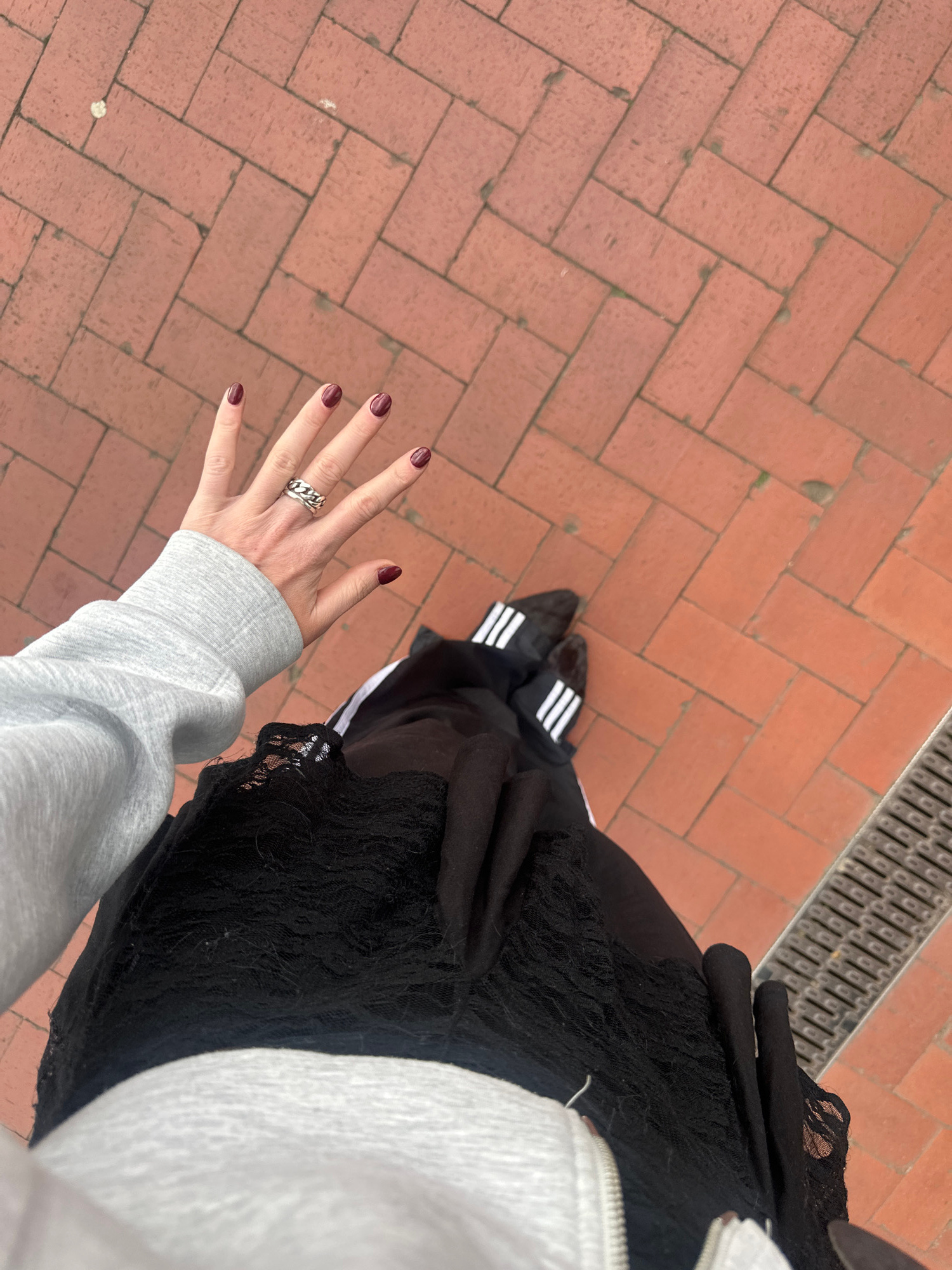 A street-level perspective shows a person standing on a herringbone-patterned brick pavement, typical of urban areas. The person's left hand is visible, displaying manicured nails painted in a dark re…read more