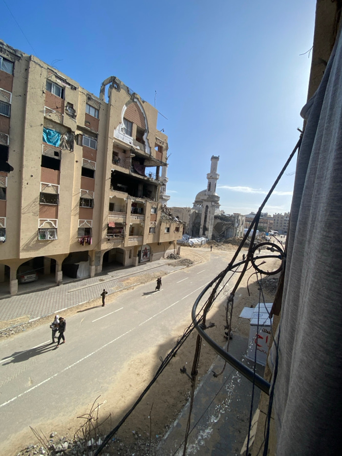 The image depicts a scene of extensive urban devastation under a clear blue sky in Khan Yunis, Palestinian Territory, viewed from a slightly elevated position, possibly a balcony, with a grey fabric a…read more