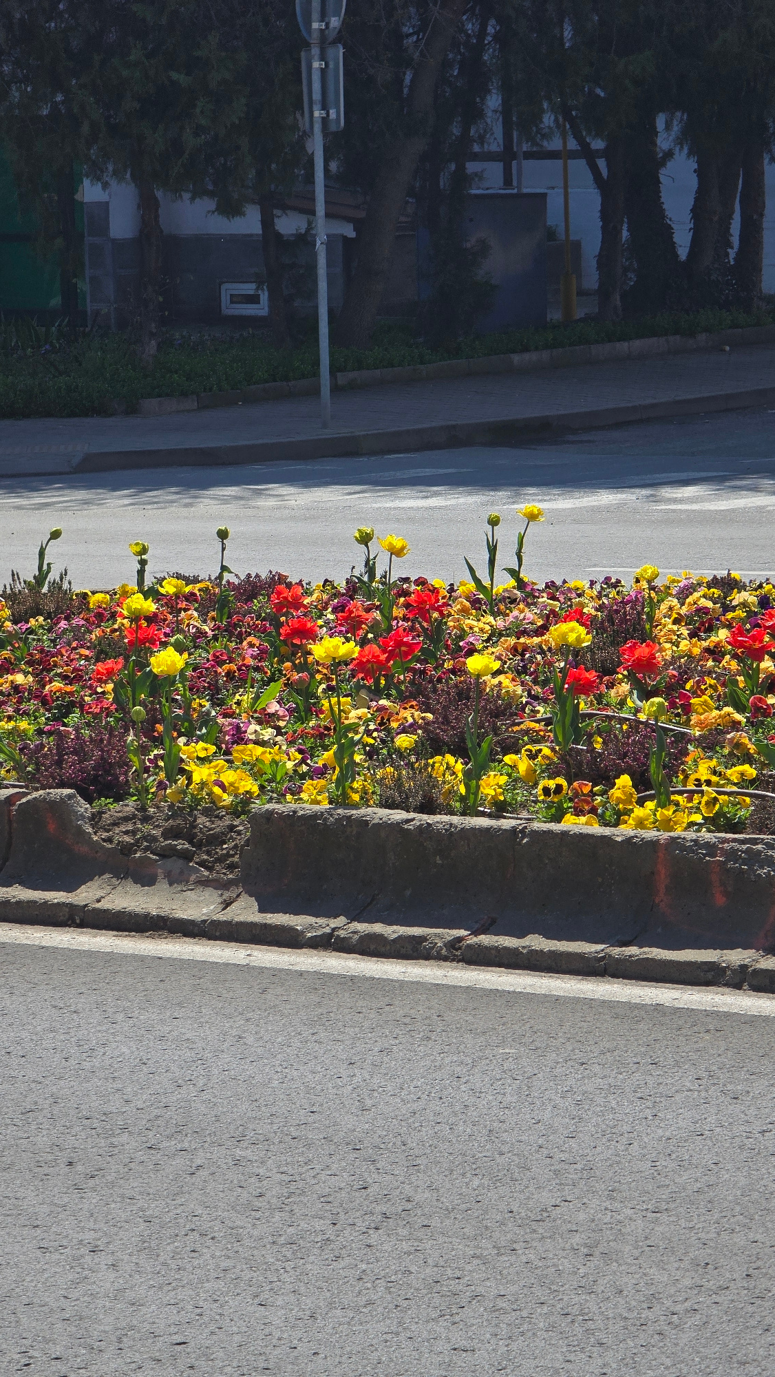 The image shows a flowerbed in Stara Zagora, Bulgaria, located between a road and a sidewalk. The flowerbed is filled with red, yellow, and purple flowers. The road is asphalt and the sidewalk is conc…read more