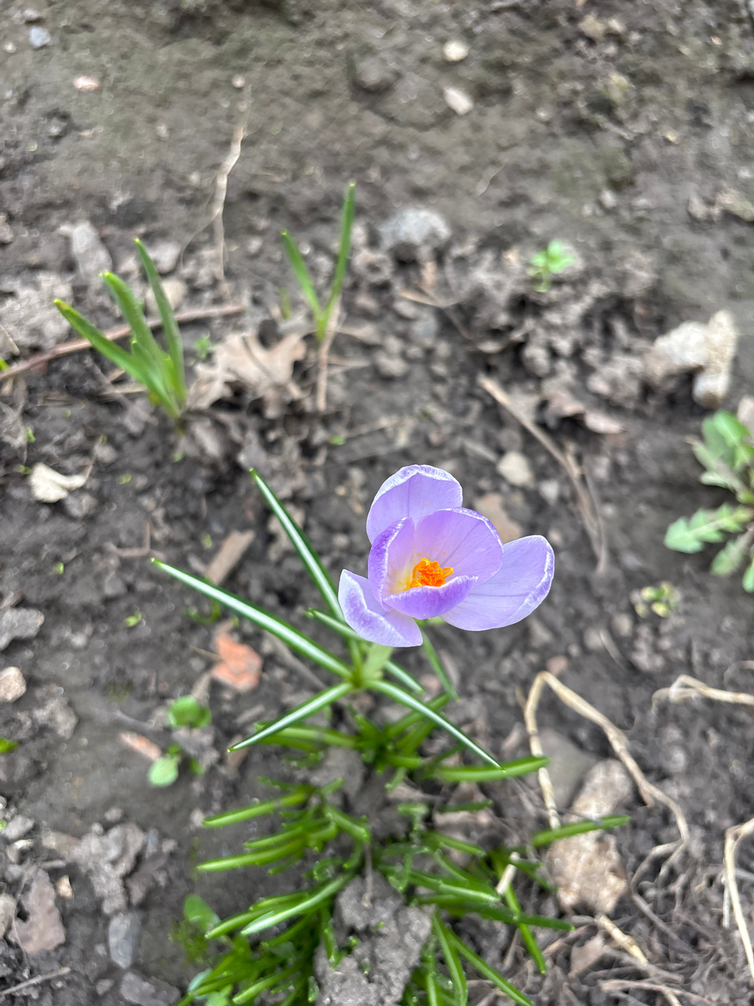 A single purple crocus flower with an orange center is growing out of dark, damp soil. Green, needle-like leaves surround the base of the flower. The background consists of dirt, small pebbles, and so…read more