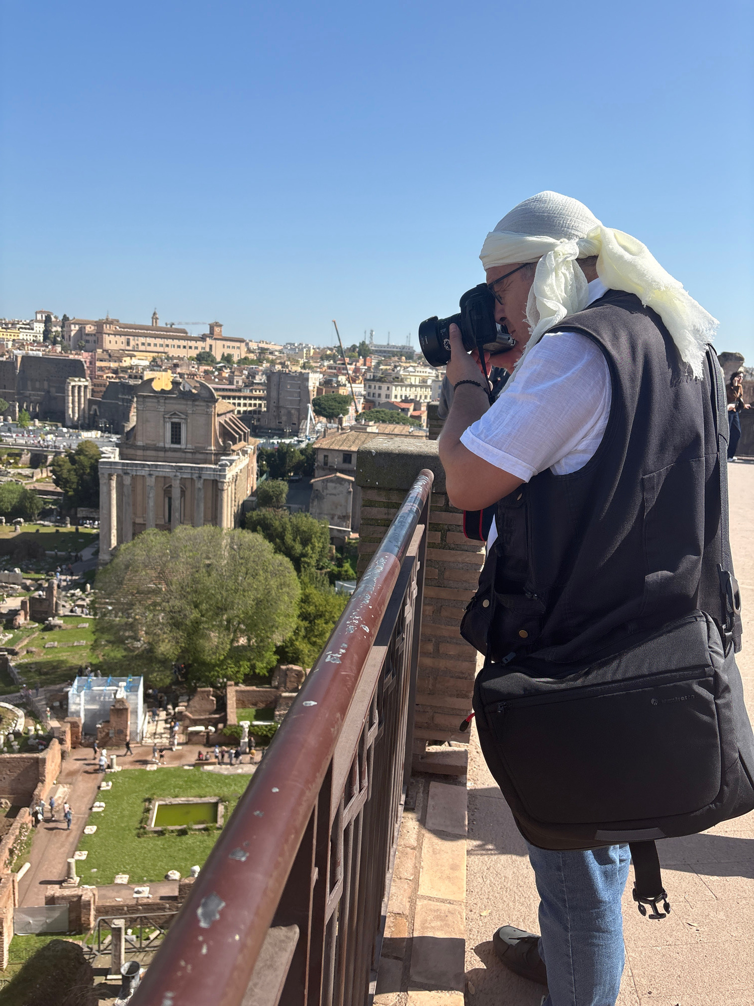 The image, taken from a high vantage point, shows a person engrossed in photography, overlooking an extensive landscape of ancient Roman ruins and a cityscape under a clear blue sky. The scene is brig…read more