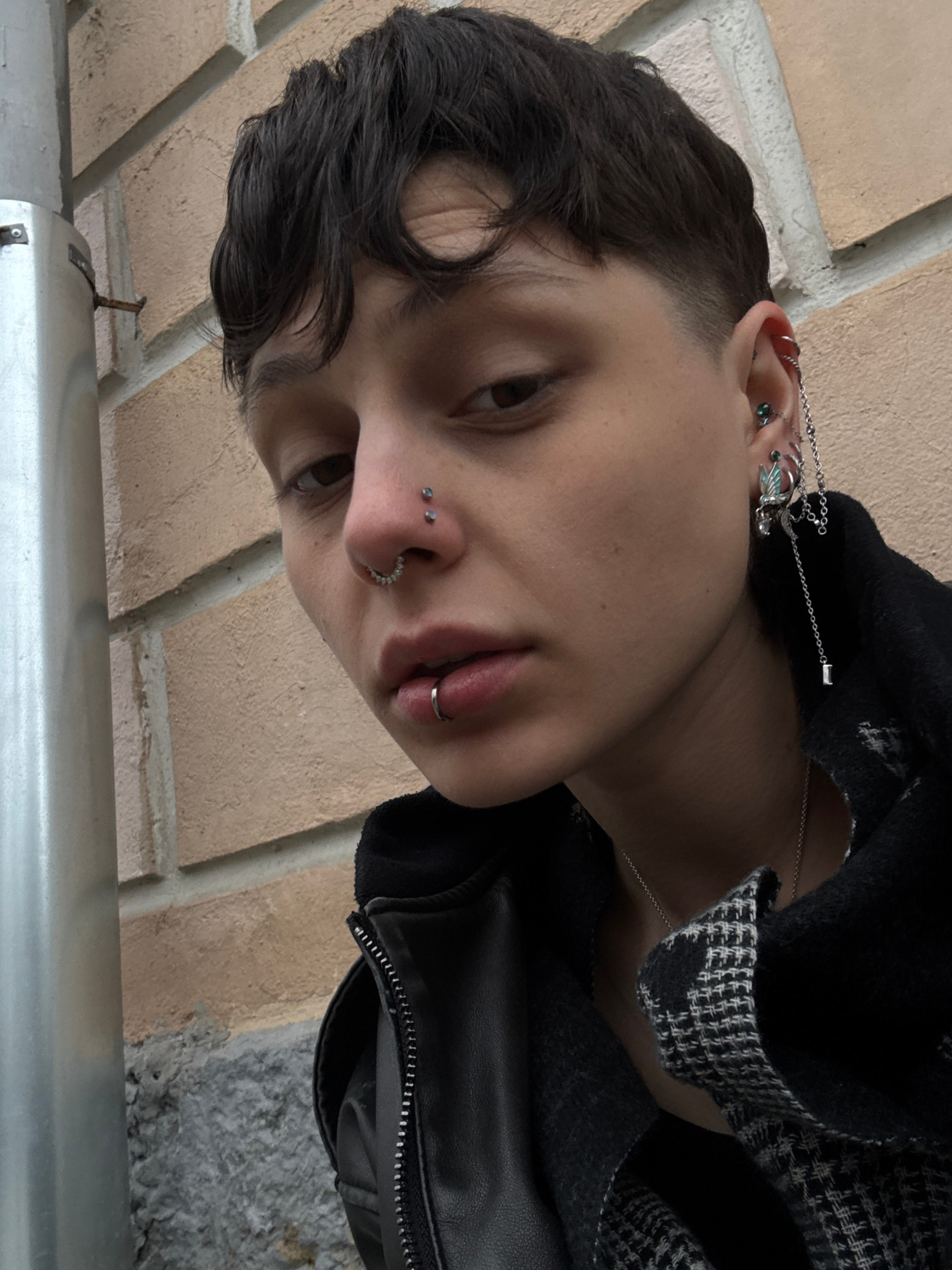 A person with short dark hair and multiple facial piercings, including nose and lip rings, gazes downward. The individual is wearing a dark jacket with a patterned lining. Behind the person is a light…read more