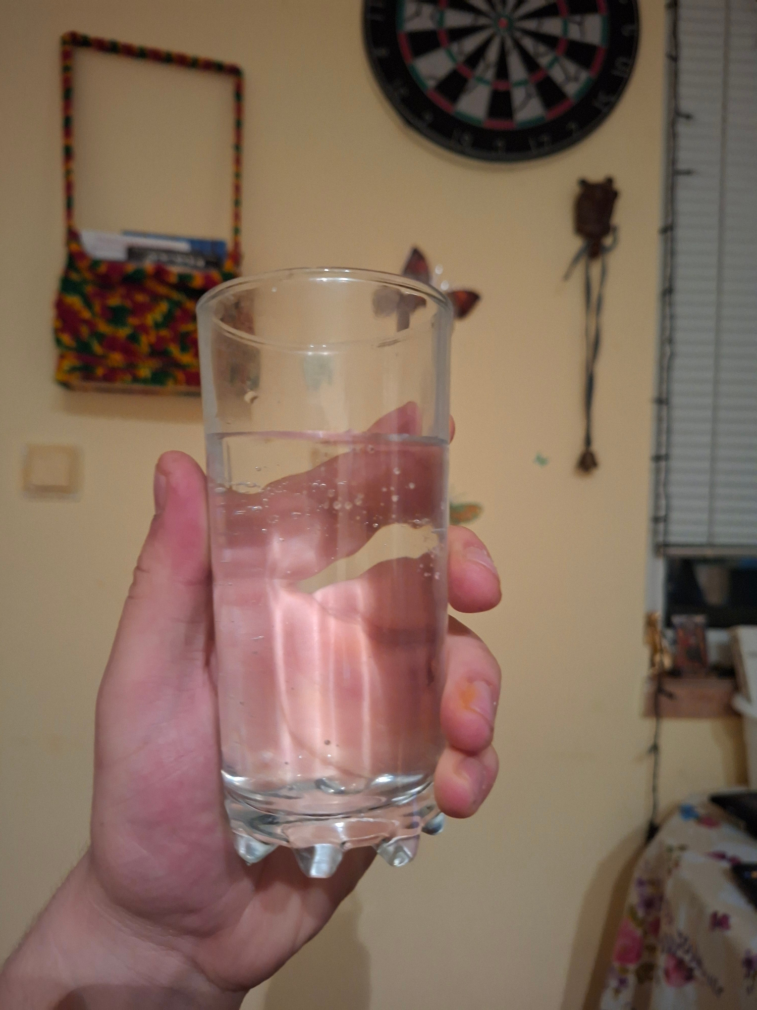 A hand holds a glass of liquid. In the background, a dartboard, a wall decoration, and a framed display are visible on a light-colored wall. The location is not specified.