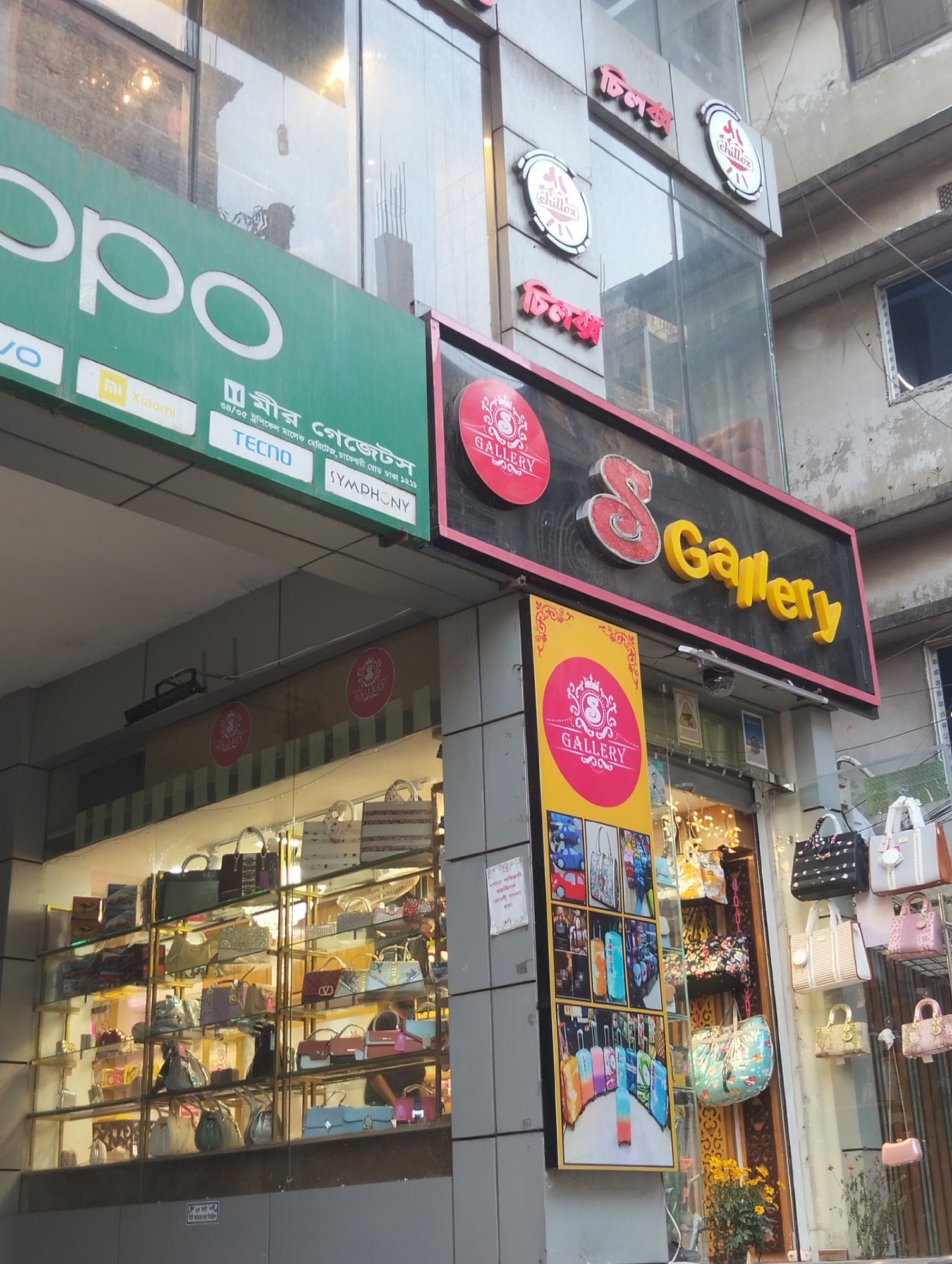The image captures the exterior of a commercial building in Dhaka, Bangladesh. Several businesses are visible. An OPPO advertisement overhangs "S Gallery," a handbag shop showcasing a variety of bags…read more