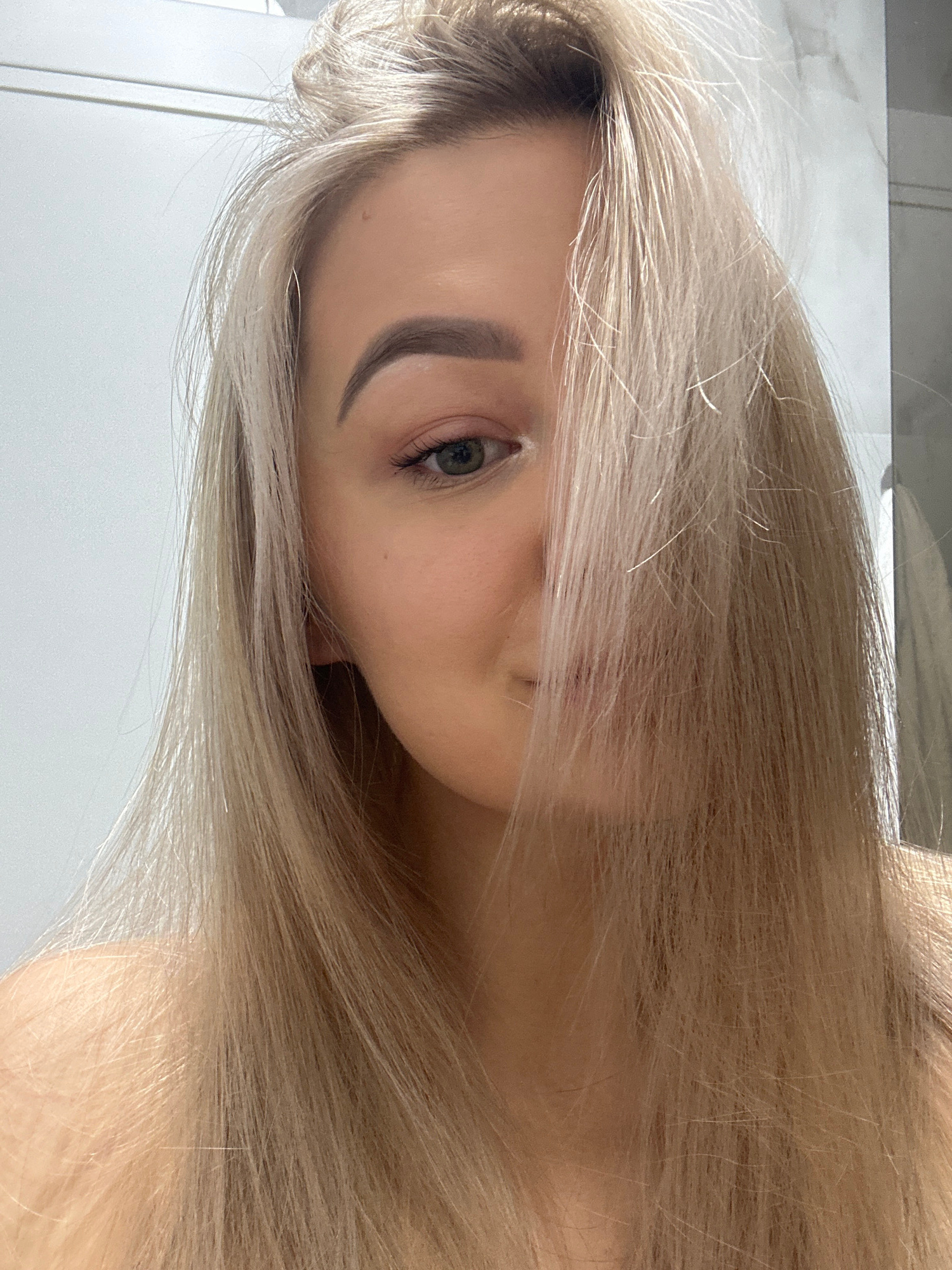 A close-up portrait shows a person with long, blonde hair partially obscuring their face. One eye is visible, and the background appears to be a white wall or surface. The image is rotated to the side…read more