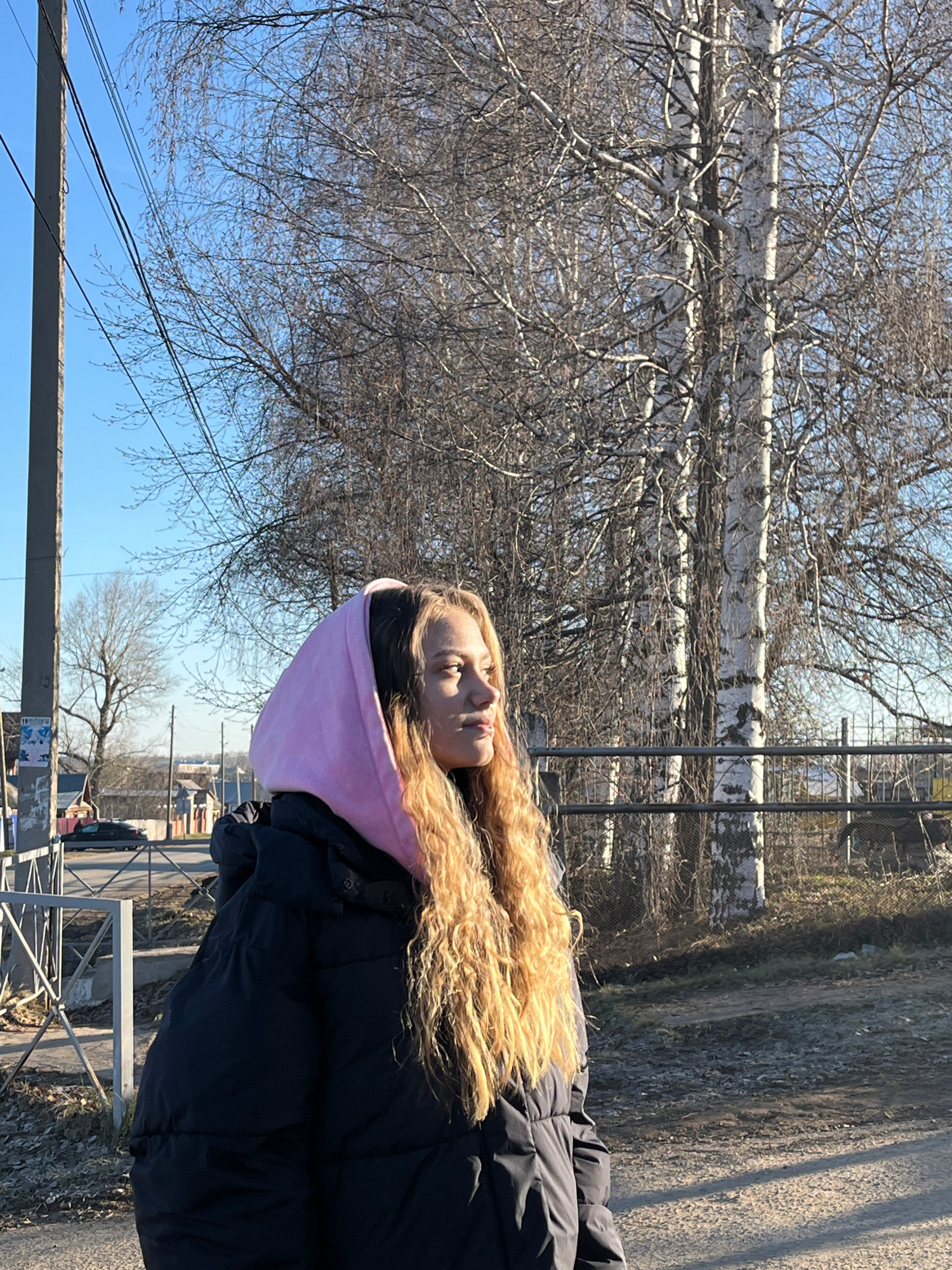 A woman with long, curly, blonde hair and a pink hood around her head is standing on a sidewalk. She is wearing a black puffy coat. To her left are several birch trees with no leaves. A gray road and…read more