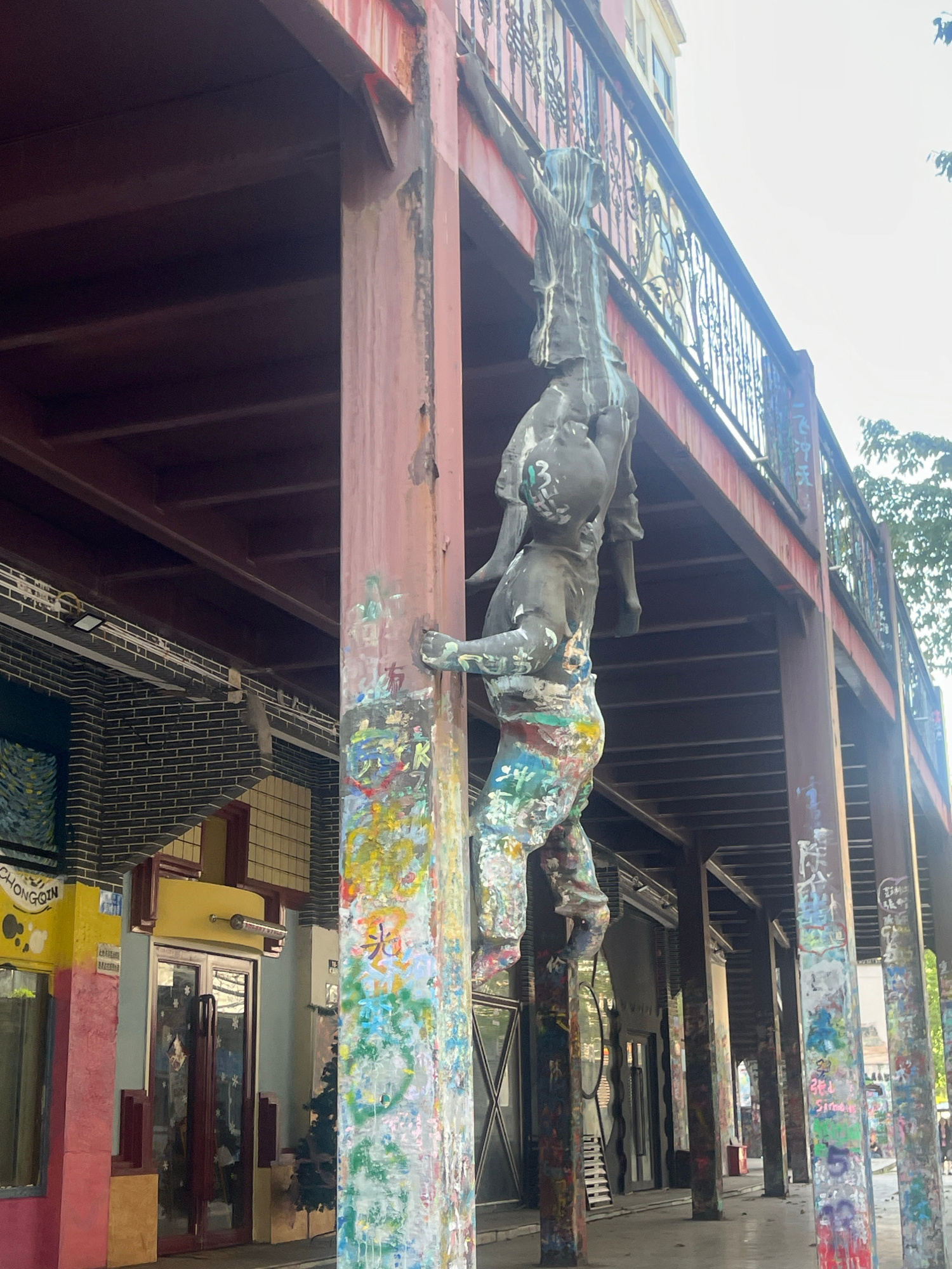The image depicts a building in Jiulongpo District, China, likely an art installation or a building facade with artistic elements. The most striking feature is a sculpture of a reclining figure mounte…read more