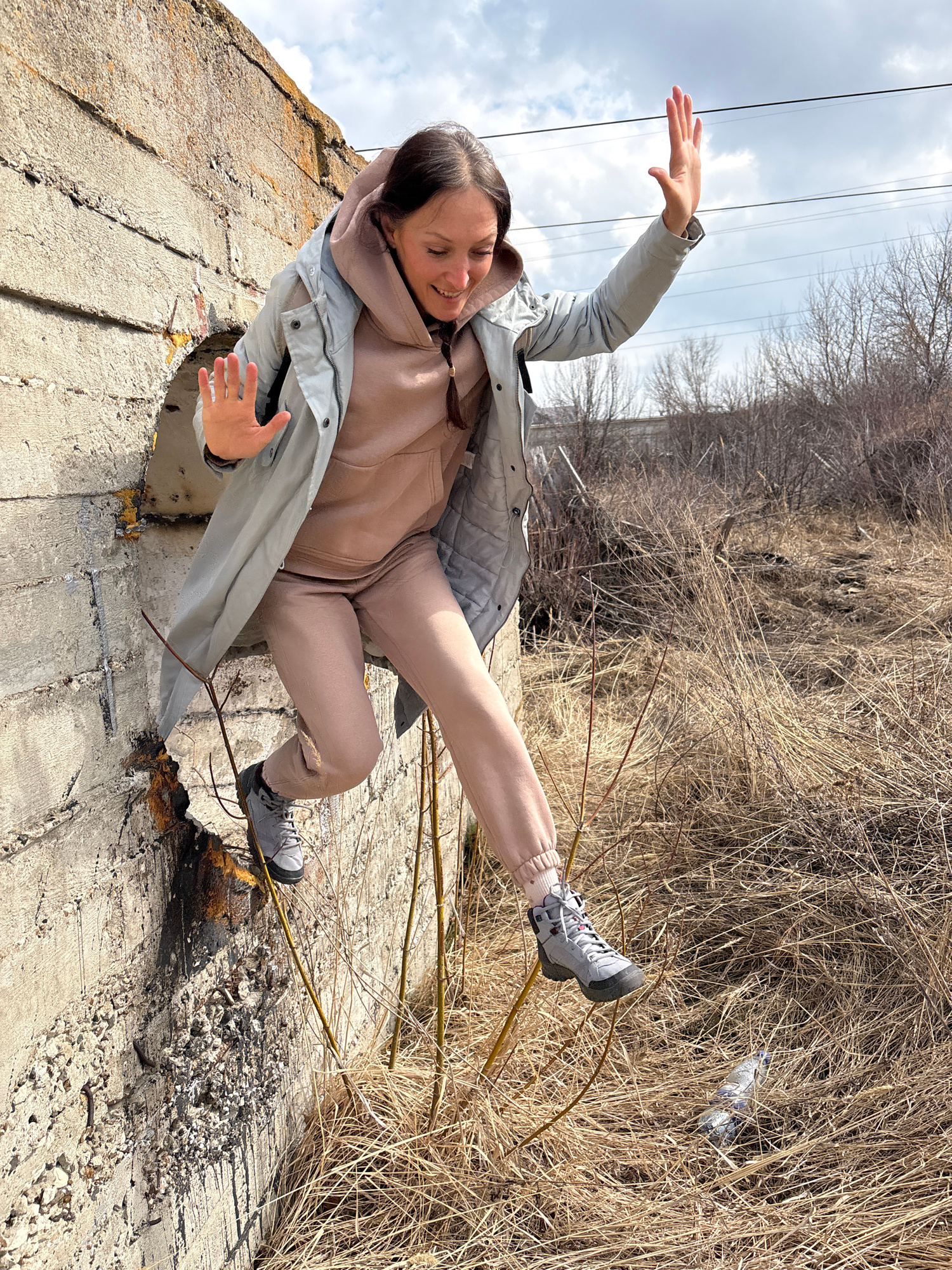 A woman is posing for a photograph in Ulyanovsk, Russia. She is reclining on a concrete structure, extending her arms outward. She is wearing a light gray jacket, a light brown hoodie, light brown sweatpants, and gray sneakers. Behind her is a patch of dry, brown vegetation. Above her, telephone wires are visible against a cloudy sky. A plastic bottle is visible amidst the vegetation. The concrete structure appears damaged, with exposed rebar and crumbling edges. | Open Wire