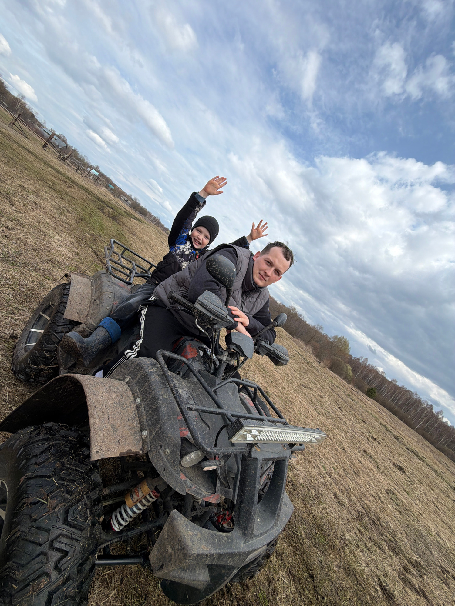 A father and child are on a four-wheeled all-terrain vehicle (ATV) in a field near Кемуль, Russia, on a cloudy day. The adult male, wearing a dark jacket and vest, sits on the ATV, operating it, and l…read more