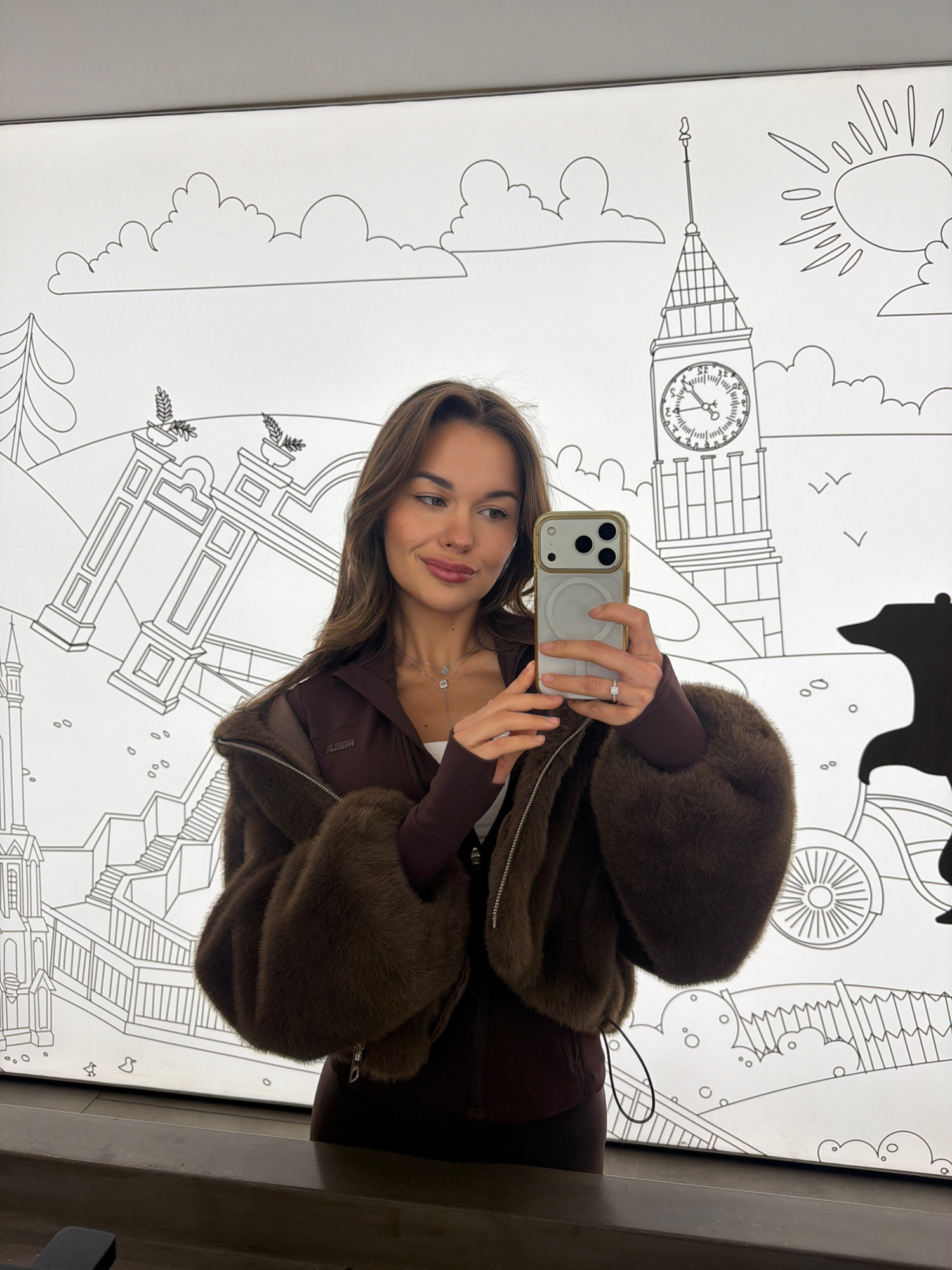 A selfie shows a young woman with brown hair and fair skin holding a cell phone. She is wearing a brown jacket with fur lining. She is standing in front of a wall depicting a drawing of London, which…read more