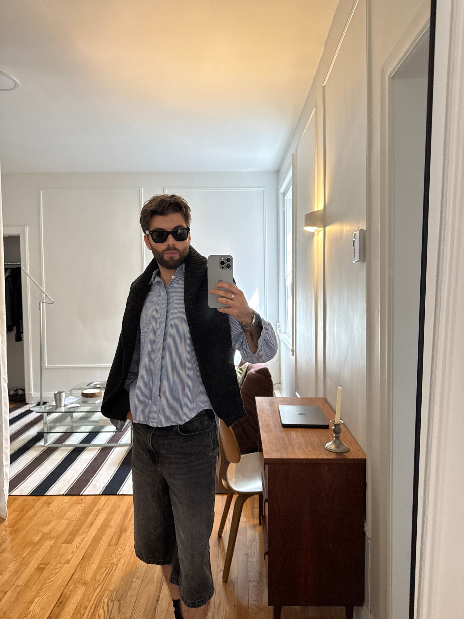 A fair-skinned man with dark hair, a beard, and sunglasses is taking a selfie in a mirror. He is wearing a light blue striped shirt, a dark cardigan, and dark jeans. The reflection shows a room with w…read more