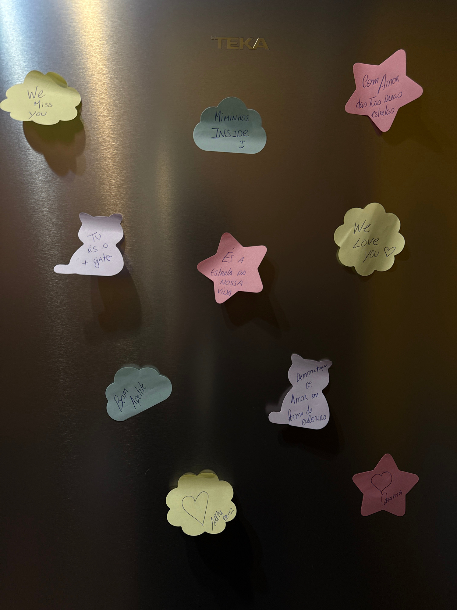 A stainless steel appliance, identified by the "TEKA" logo in the upper center, is vertically oriented and serves as a backdrop for ten distinct sticky notes. The metallic surface exhibits a brushed f…read more