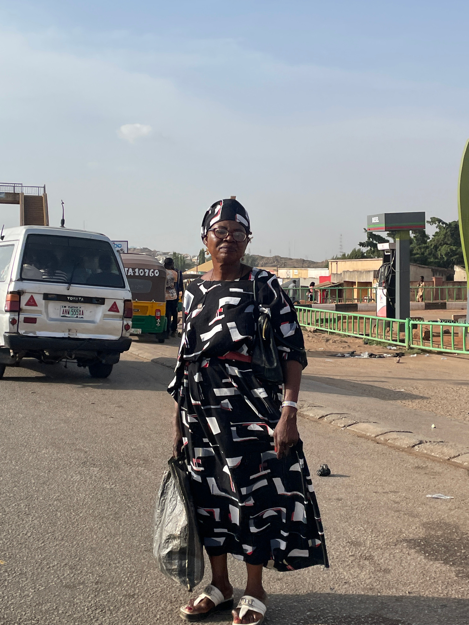 The image shows a woman standing on a street in Jos, Nigeria. She is wearing a black and white patterned dress and a headscarf. She is holding a dark-colored bag. Behind her is a white Toyota Hiace va…read more