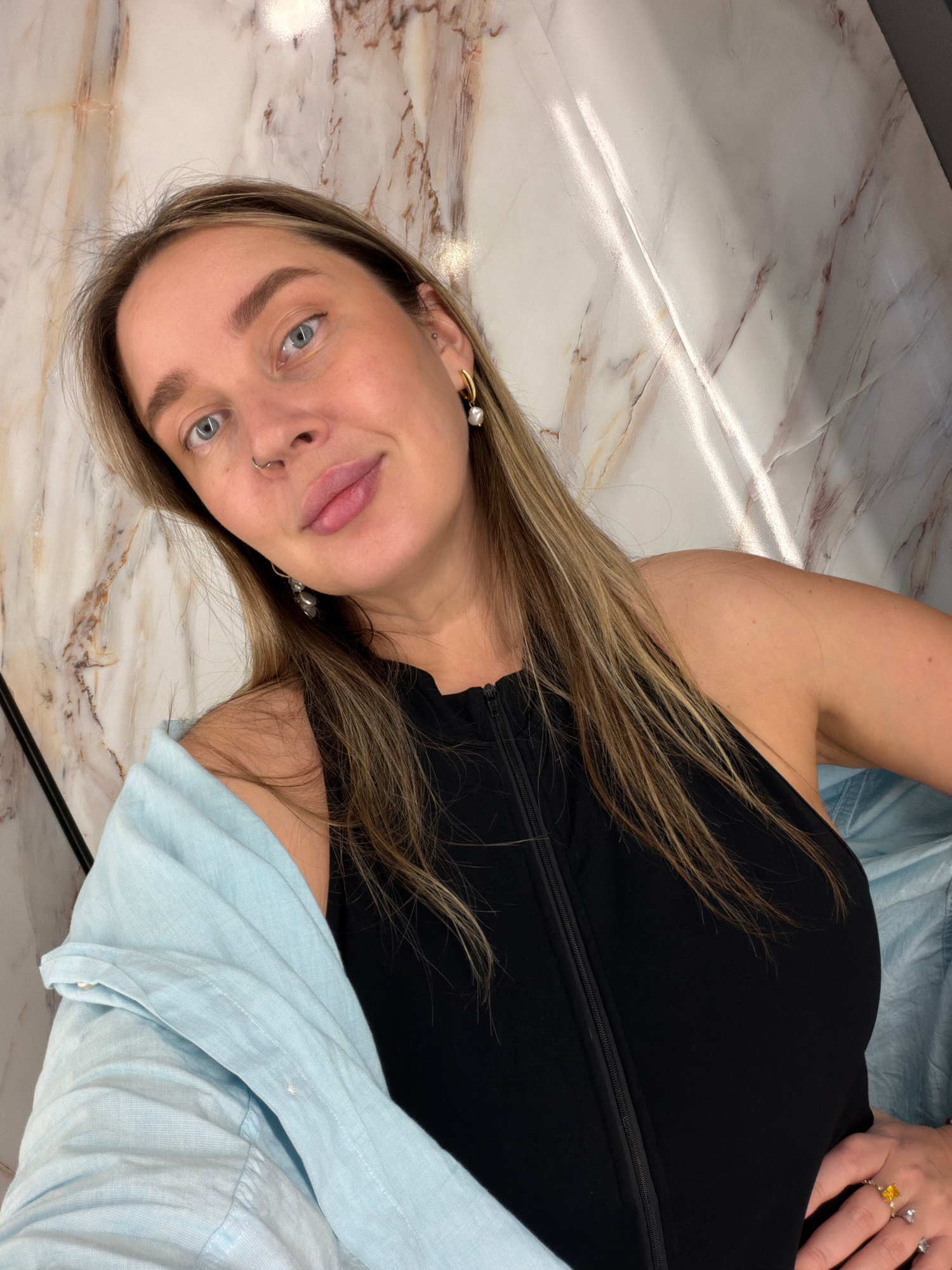 A woman lies on a marble surface. She wears a black top, light blue shirt, and several rings on her right hand. She has a nose ring and earrings. The floor appears to be made of marble. The location c…read more