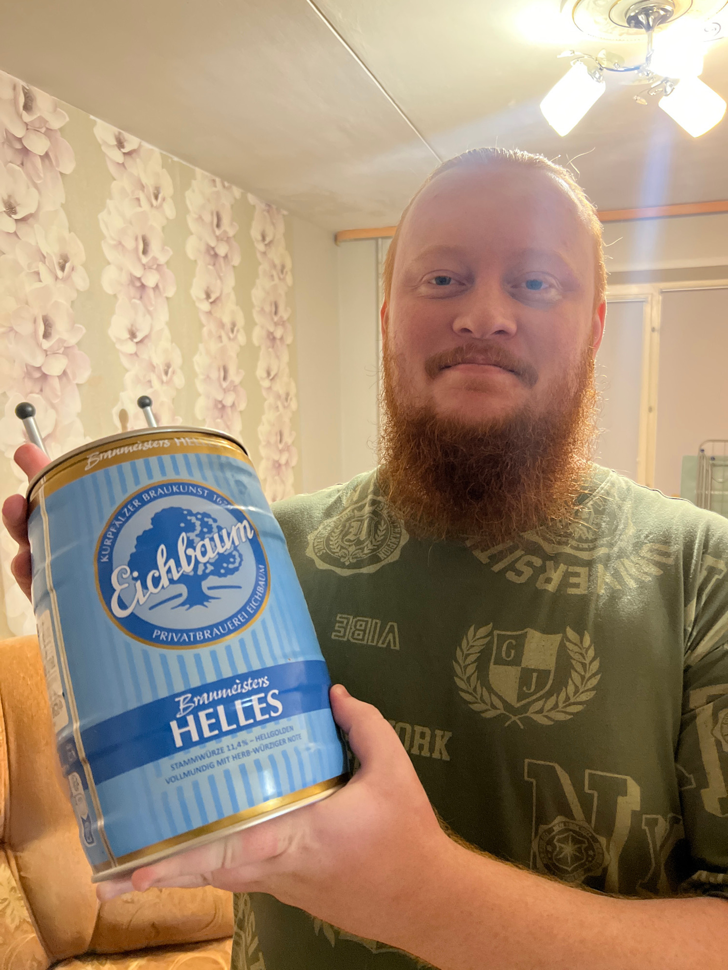 A man with a prominent red beard and short reddish hair is captured indoors, looking directly at the camera with a neutral expression. He is holding a large blue and gold mini-keg of German "Eichbaum"…read more