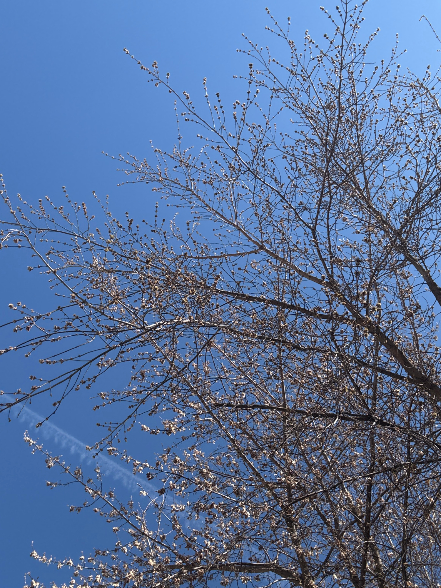 The image shows tree branches against a clear blue sky. The branches are bare except for small buds. In the lower right corner of the image, there is a faint contrail from an aircraft. There is no inf…read more