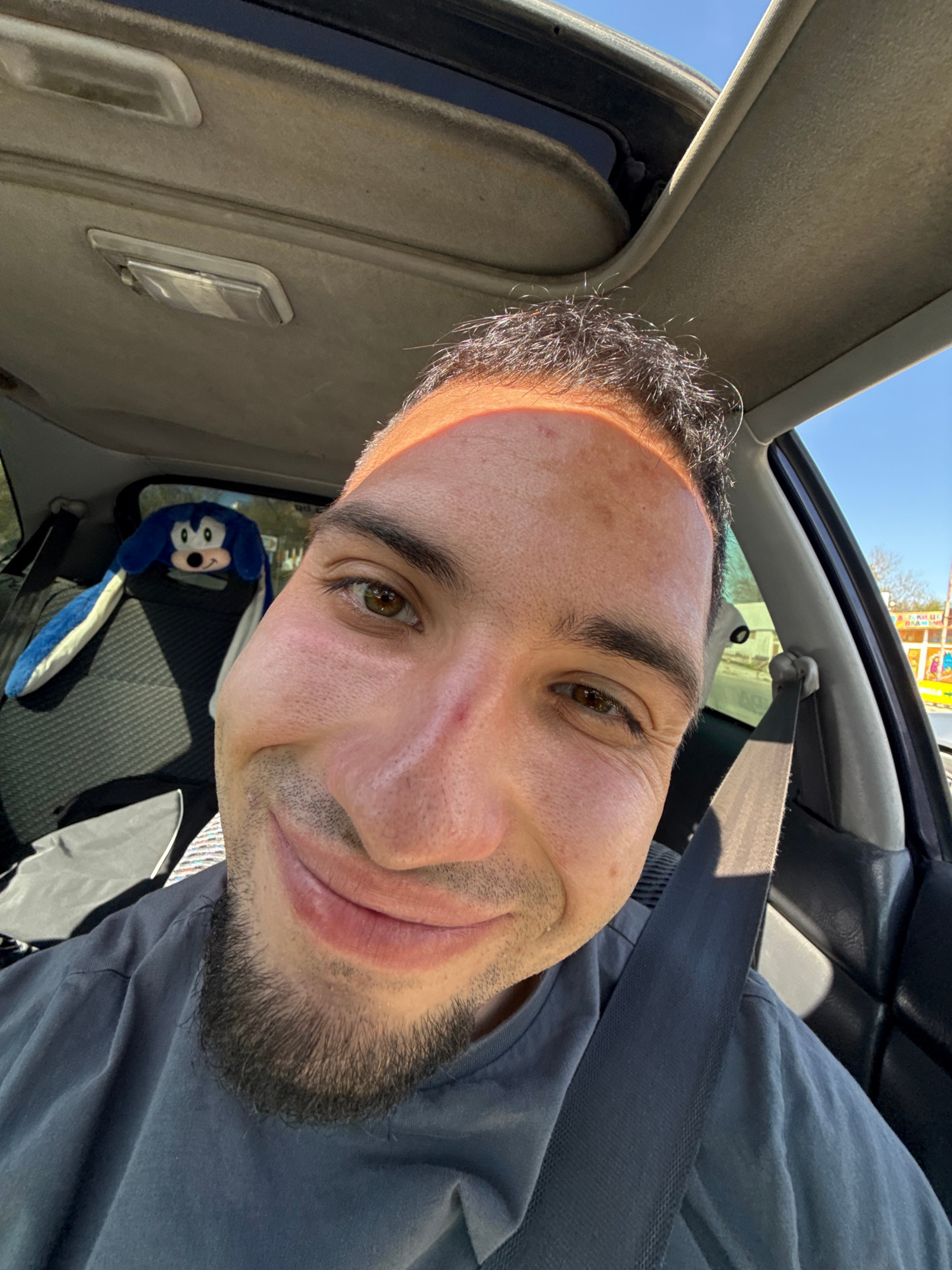 A man is captured in a selfie-style shot from inside a car, likely in Shumen, Bulgaria, as indicated by the location context and partially visible Bulgarian text on an outdoor sign. He appears to be i…read more