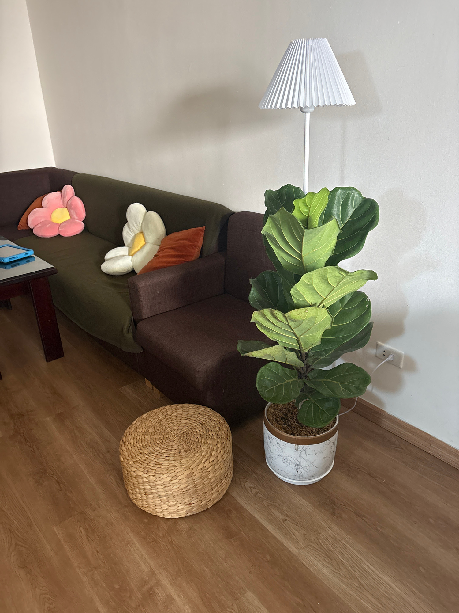 The image shows an indoor scene with a variety of objects. The floor is wooden. A brown and green couch is positioned in the foreground, adorned with flower-shaped pillows in white and pink. An orange…read more