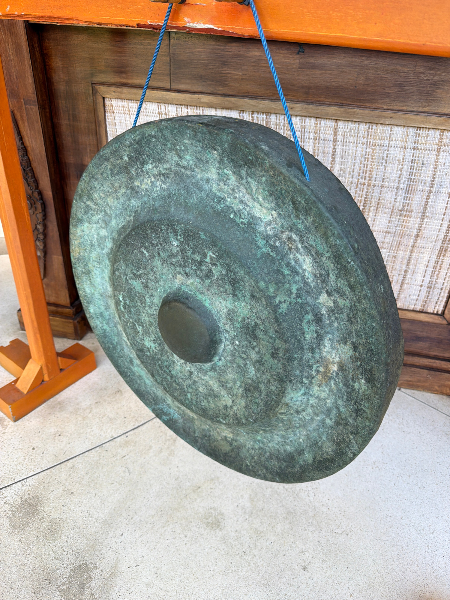 The image shows a large, round, greenish-blue metal gong, likely made of bronze due to the color. It is mounted on a wooden stand. The gong has concentric circles pressed into its surface. A blue rope…read more