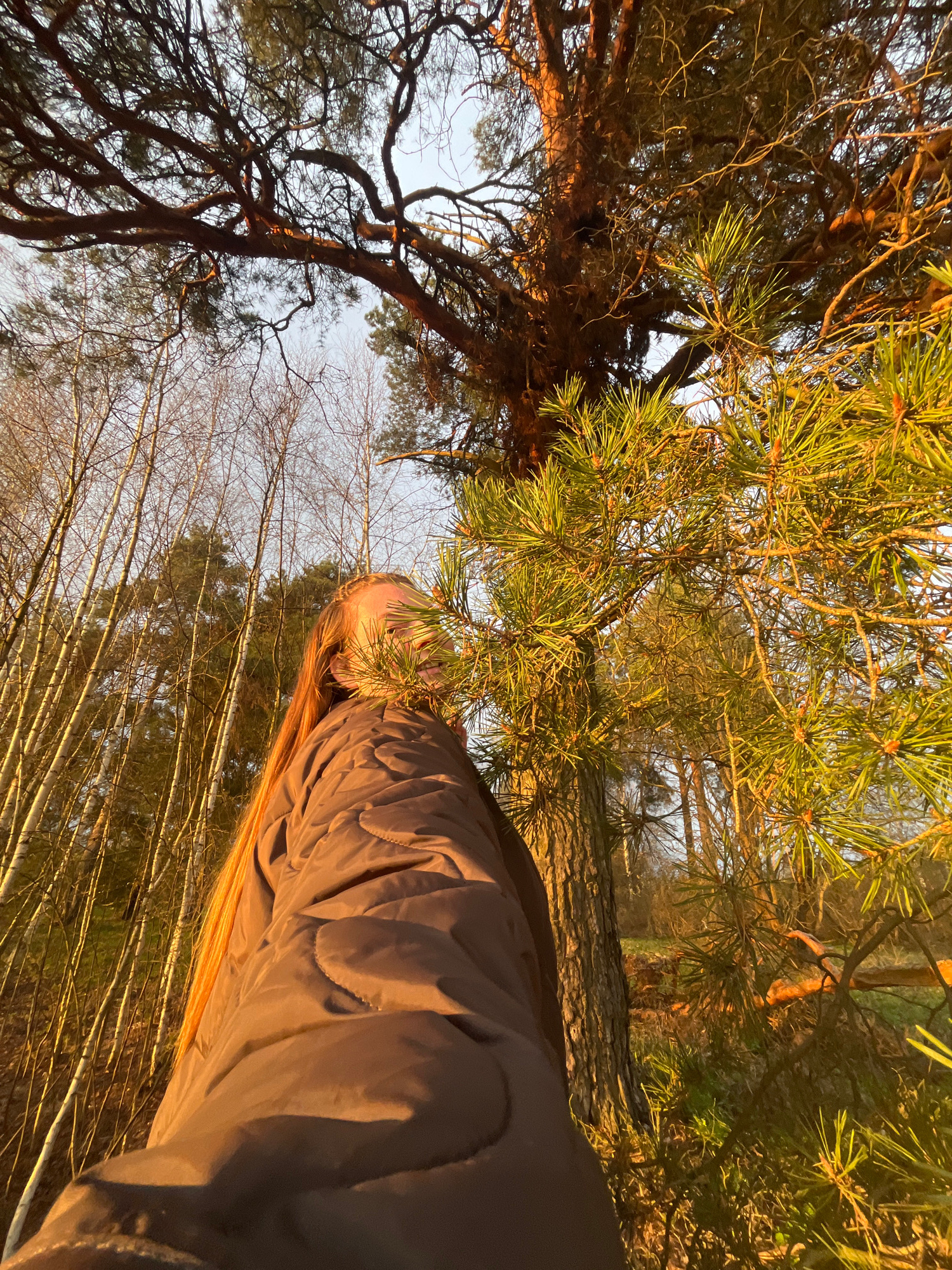 The image depicts an upward view into a sunlit forest canopy, likely during the golden hour of late afternoon or early morning. A person is partially visible on the right side of the frame, facing awa…read more