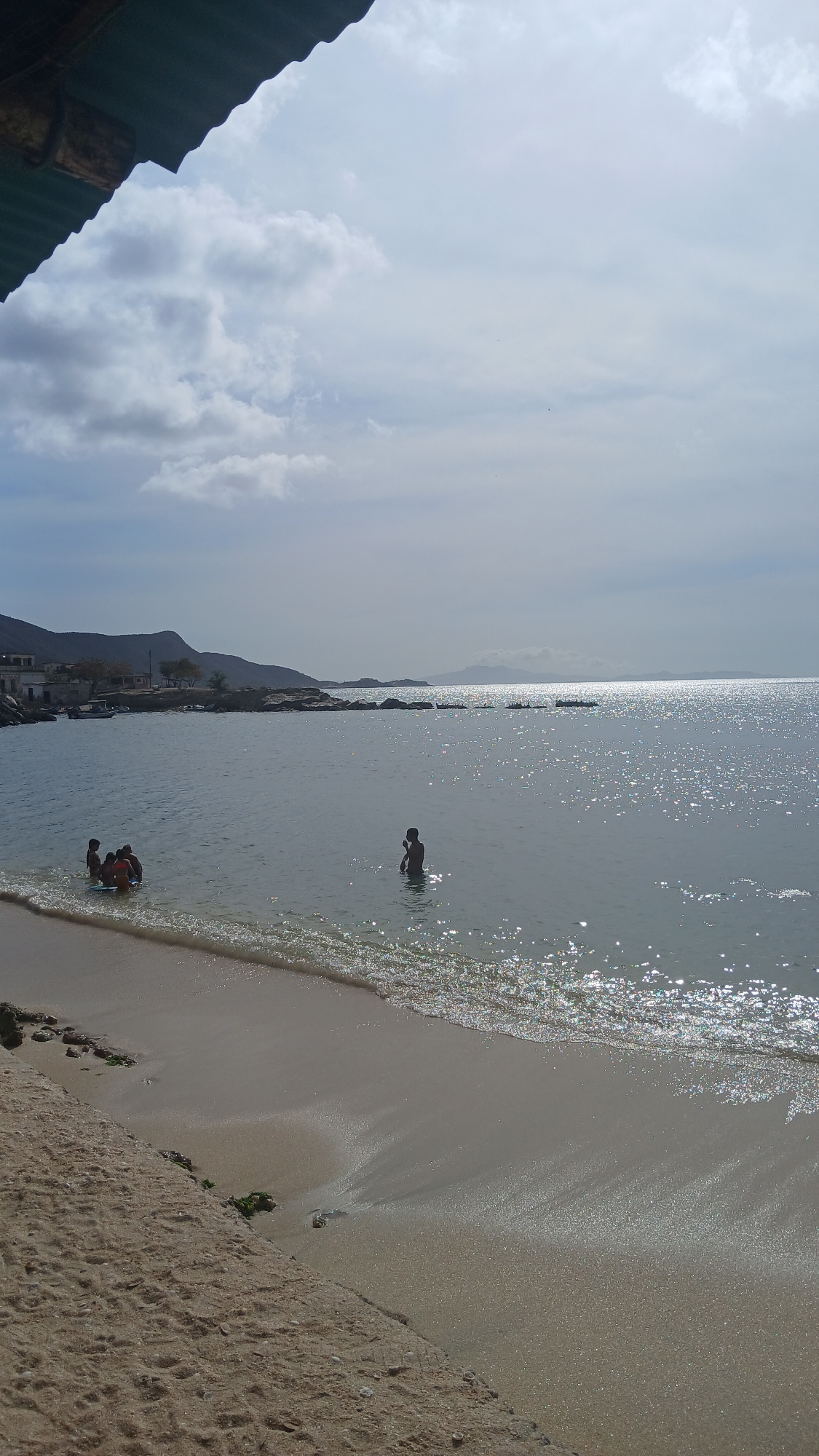 The image depicts a beach scene in Juan Griego, Venezuela. The focus is on the shoreline where the water meets the sand. The water is relatively calm with sunlight reflecting off its surface. A person…read more