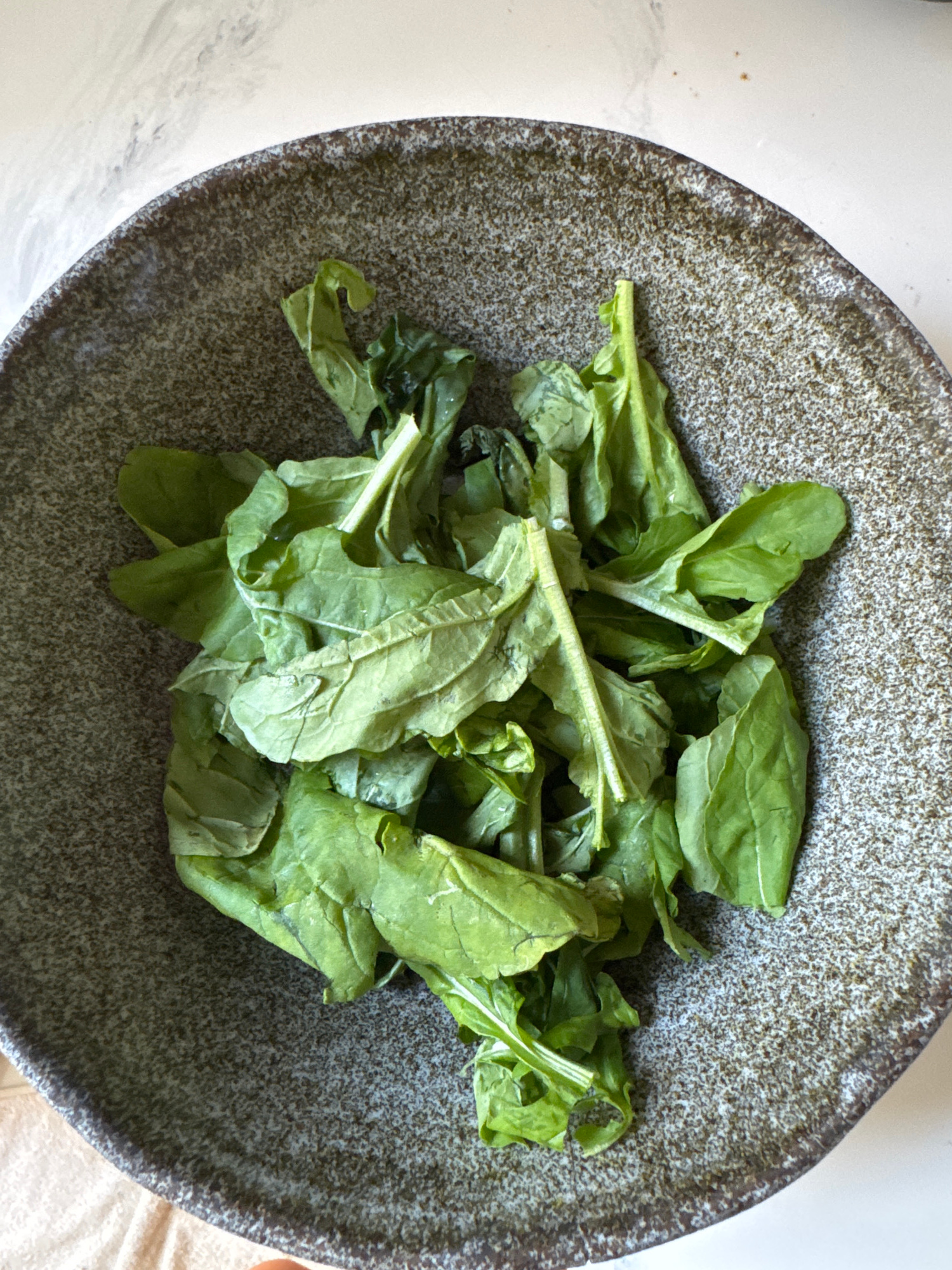 A close-up, overhead shot depicts a serving of green leafy vegetables in a speckled grey bowl, likely stoneware or earthenware. The leaves appear to be spinach or arugula, with visible stems and varia…read more