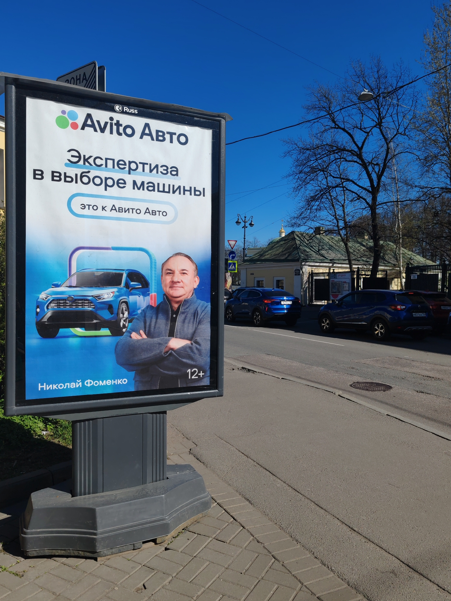 The image shows a street scene in what appears to be Saint Petersburg, Russia. A large advertising billboard stands on the sidewalk, promoting "Avito Auto" (a car marketplace). The ad features the slo…read more