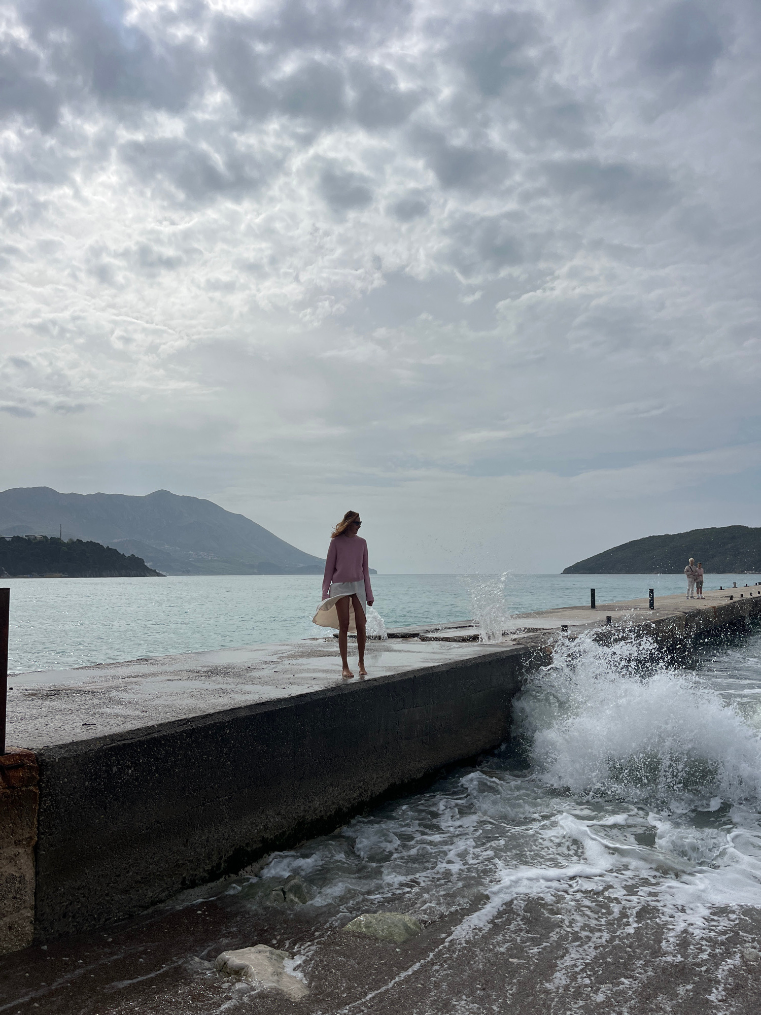 A woman stands on a pier in Budva, Montenegro. She faces the sea with her back to the mountains in the background. She is wearing a light-colored skirt and a pink sweater. Waves are crashing on the pi…read more