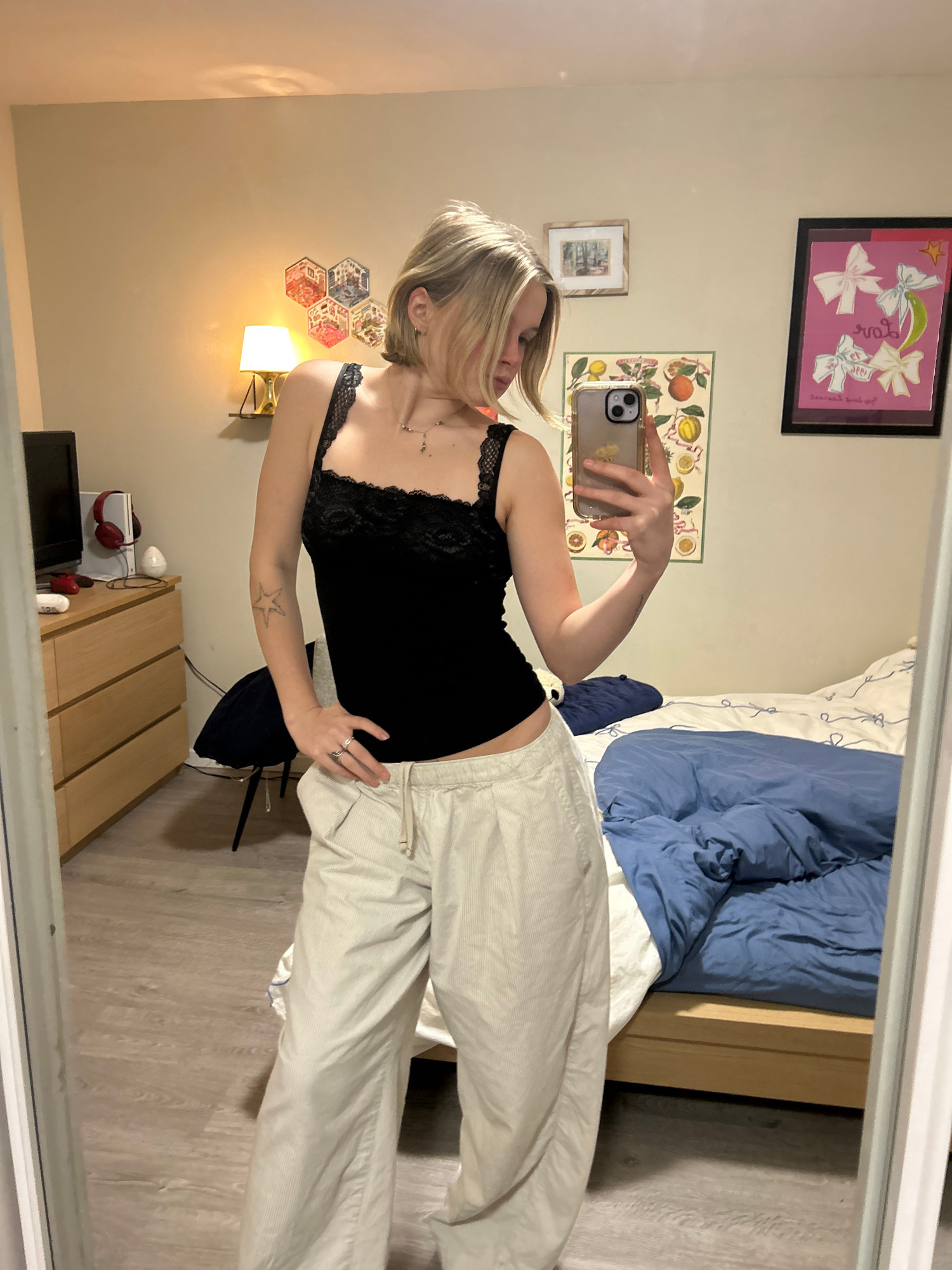 A woman is taking a mirror selfie indoors. She is wearing a black lace-trimmed tank top and light-colored, striped pants. She has blonde hair. She is holding a phone with a beige case. The room conta…read more