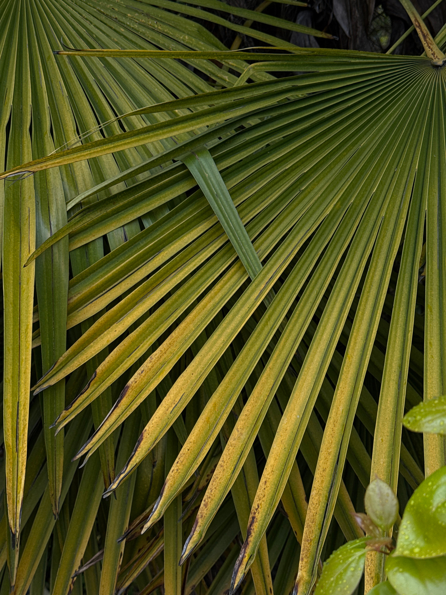 The image presents a close-up view of multiple large, fan-shaped palm leaves, possibly from a windmill palm or similar species. The leaves are predominantly green, with some sections exhibiting a yell…read more