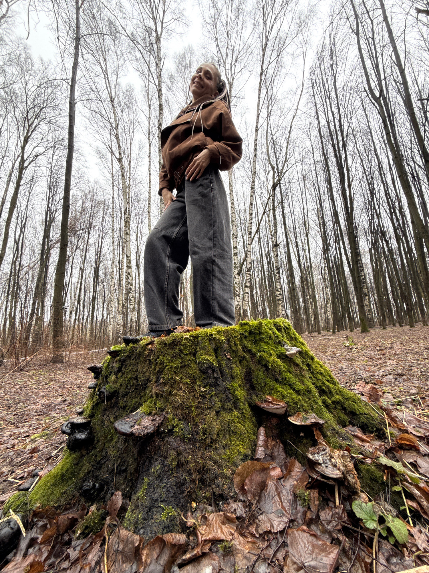 A low-angle, rotated shot shows a person in a brown jacket and black jeans standing on a moss-covered tree stump in a forest. The person, fair-skinned with light hair, is positioned on the left side o…read more