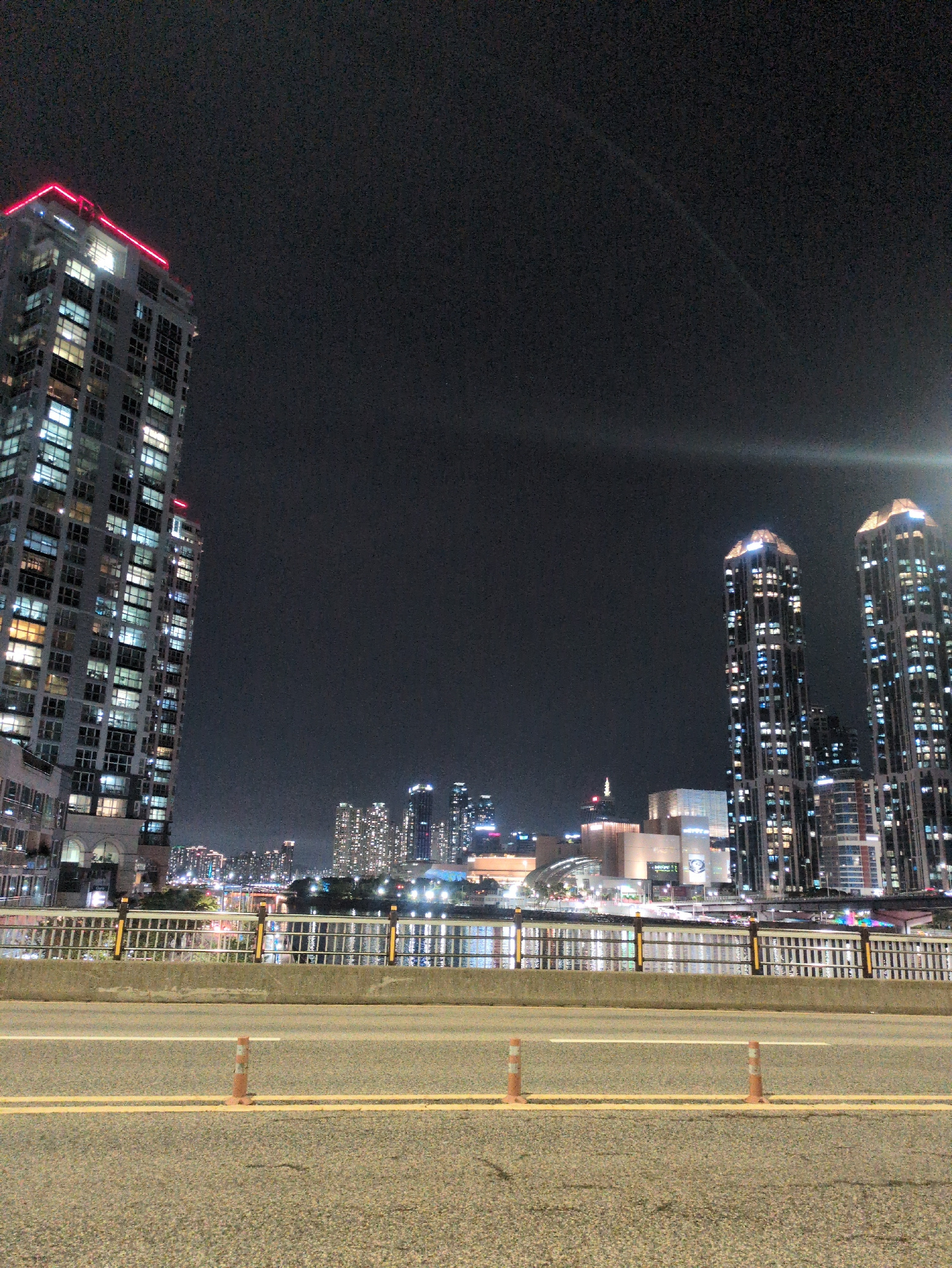 The image shows a nighttime view of the city of Busan, South Korea. The viewpoint is from a high vantage point, possibly a bridge or tall building, overlooking a cityscape with illuminated buildings a…read more