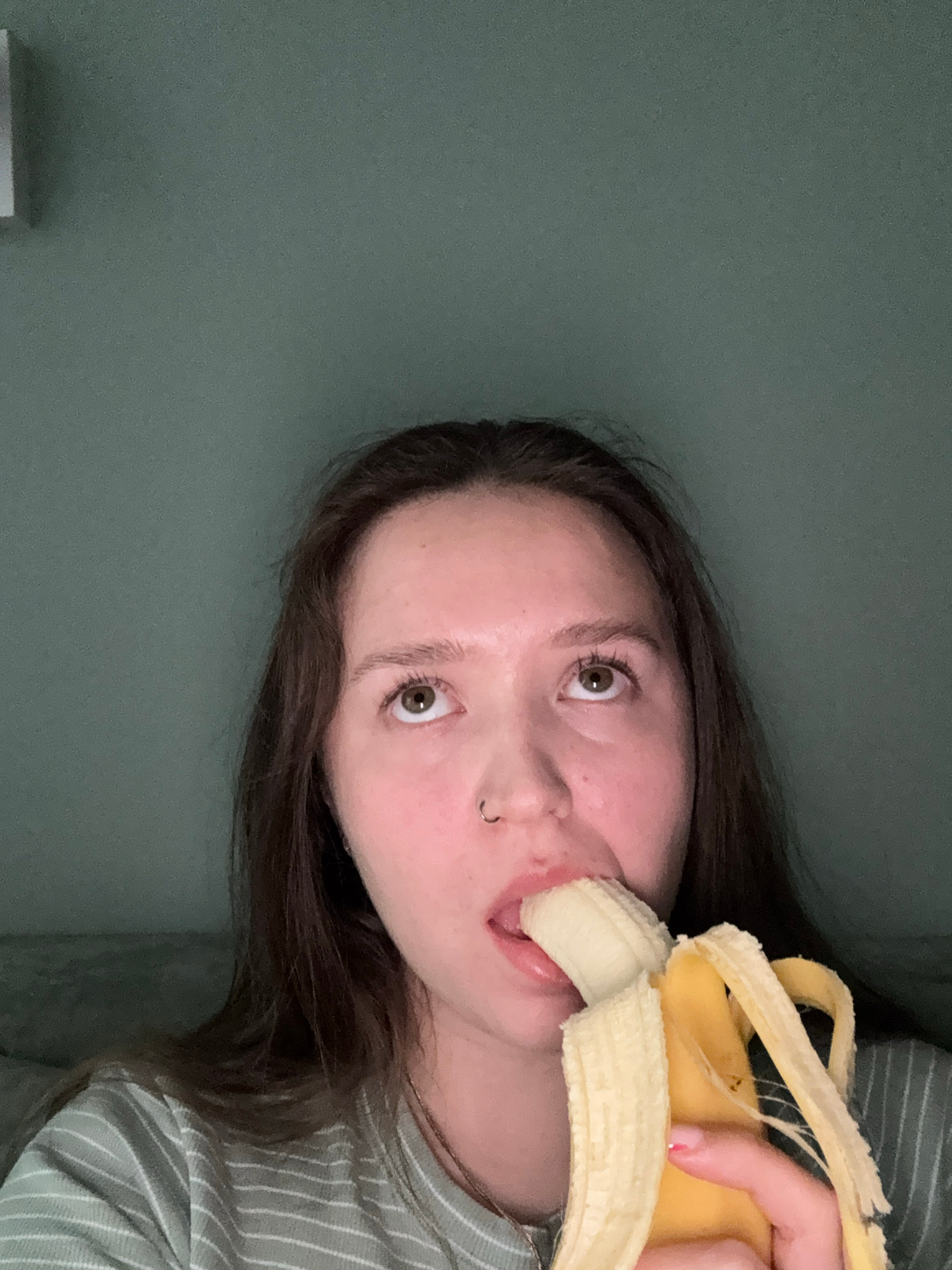A young woman is holding and eating a banana. She has brown hair, brown eyes, and a nose ring. She is wearing a light green and white striped shirt. The background is a solid, slightly darker green co…read more