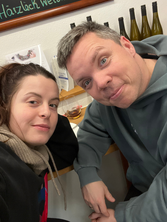 Two individuals pose for a selfie, captured at an unusual angle. The man, positioned above, sports short gray hair and blue eyes, wearing a gray sweatshirt. The woman, below, has brown hair and is dre…read more