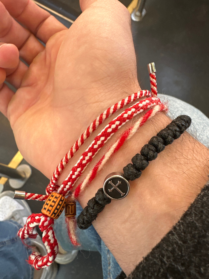 A close-up image displays a human left wrist and hand, viewed from a slightly elevated angle. The wrist is adorned with three distinct bracelets. Two are braided cords of red and white, one appearing…read more