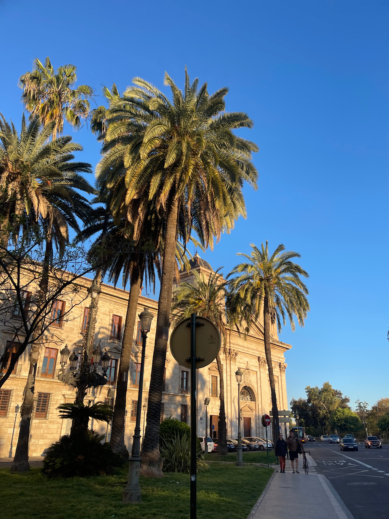 The image captures a street scene in Valencia, Spain, featuring palm trees in the foreground against a clear blue sky. A multi-story building with numerous windows and ornate architectural details sta…read more