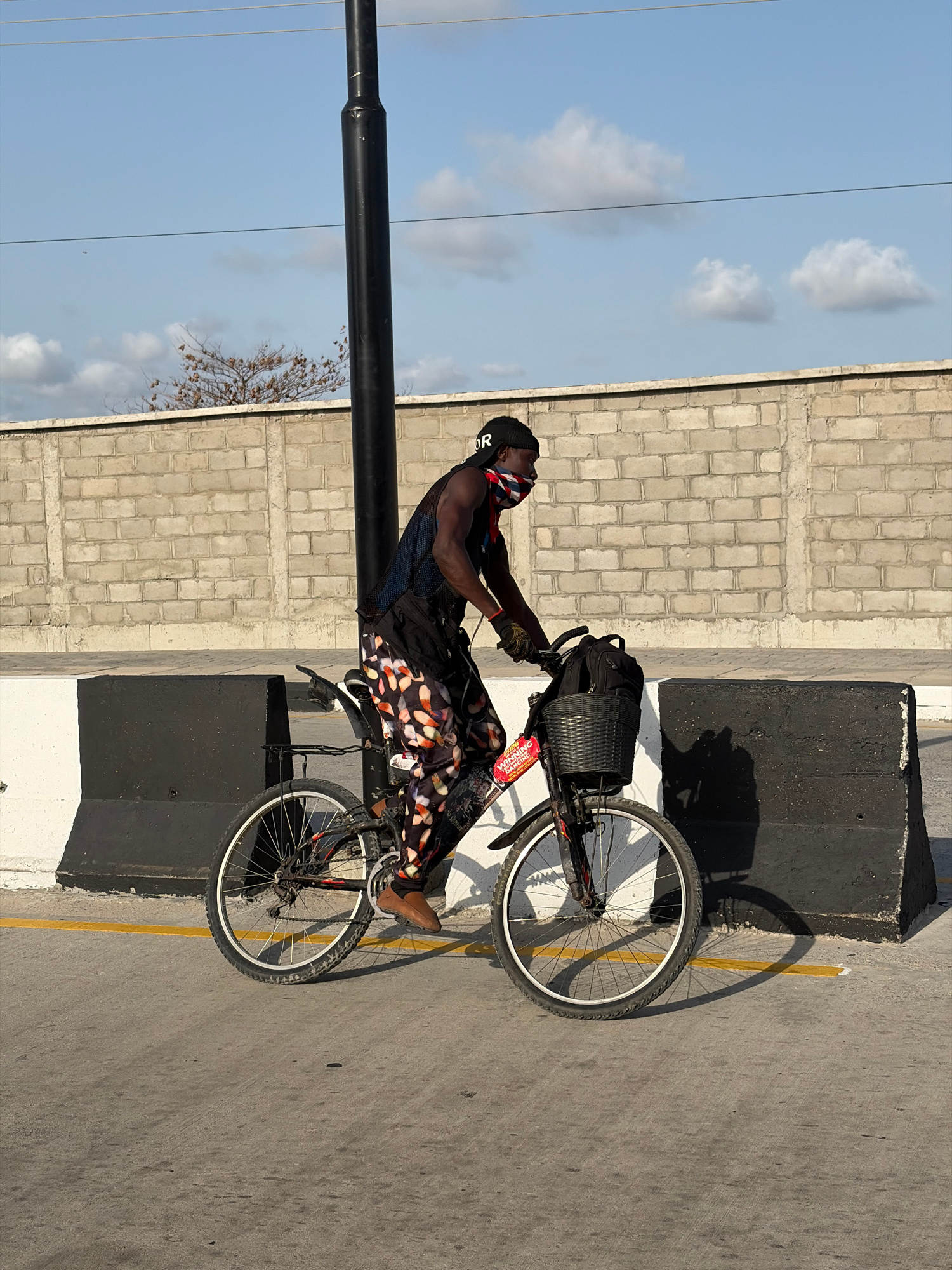 An image shows a man on a bicycle in Igboefon, Nigeria. The man is wearing a black head covering, patterned pants, a blue tank top, and gloves. He is riding a bicycle with a basket on the front. The b…read more