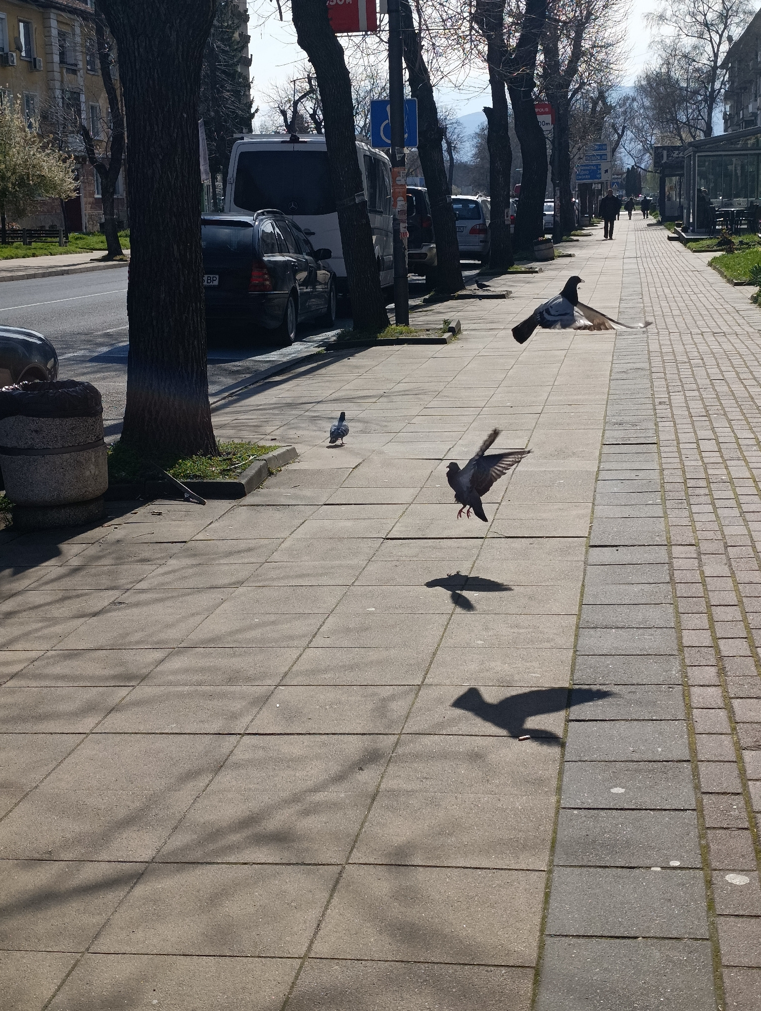 The image depicts a sunny street scene in Kardzhali, Bulgaria. A sidewalk paved with light grey square tiles, transitions into a walkway of narrower grey rectangles. Several pigeons are in various staβ¦read more